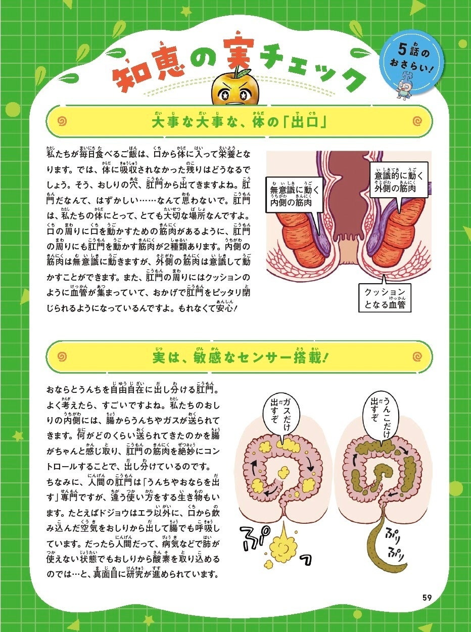 ▲5話「授業中の大ピンチ!―肛門のチカラ―」の解説ページ。本編の復習に加え、さらなる学びが広がります。