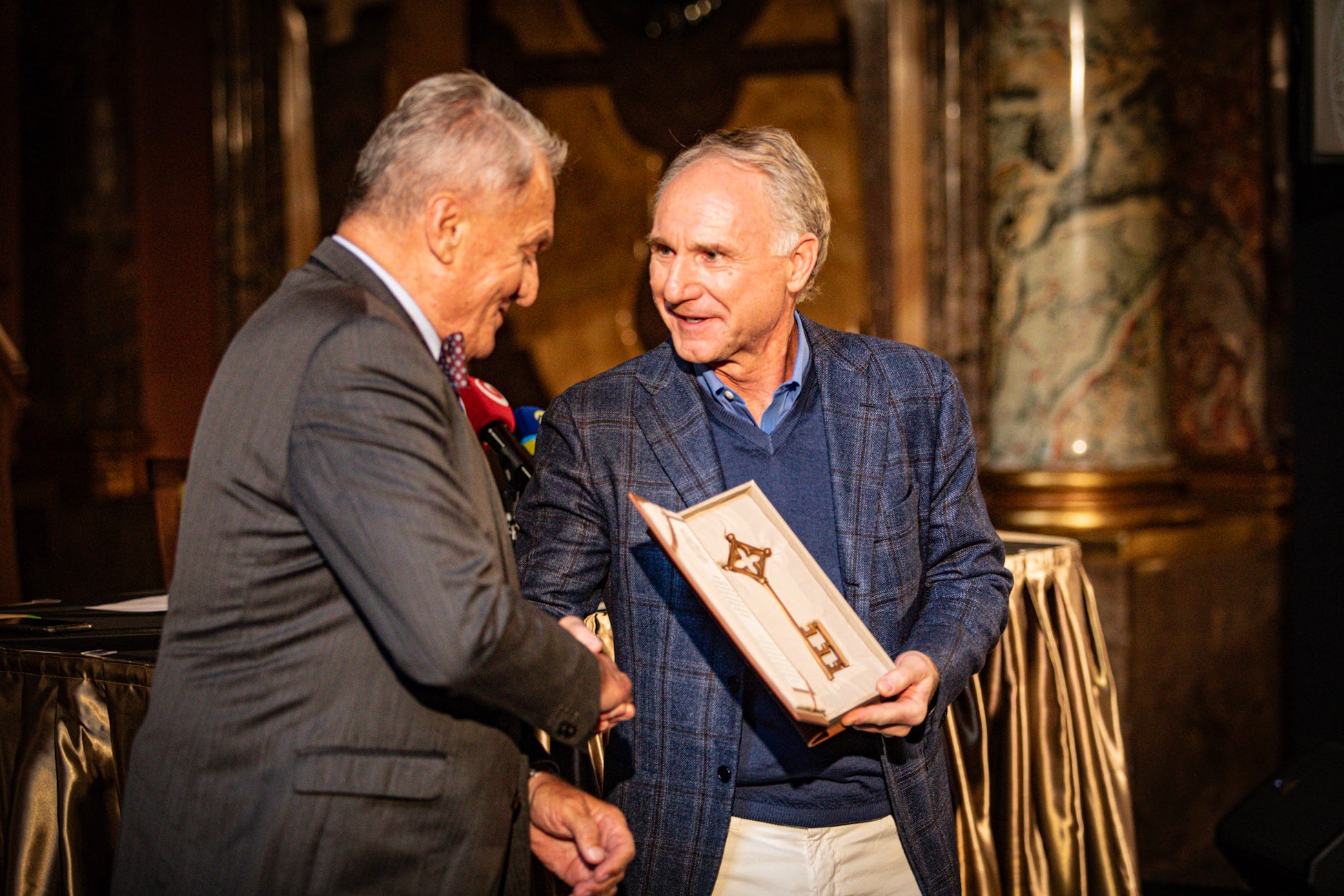 会見の冒頭では、プラハ市長が登壇し、ダン・ブラウン氏に街の象徴として「プラハの鍵」を贈呈。これに対しブラウン氏は「これまで数々の記者会見をしてきたが、今日が一番荘厳だ」と述べ、プラハの街並みを絶賛した。