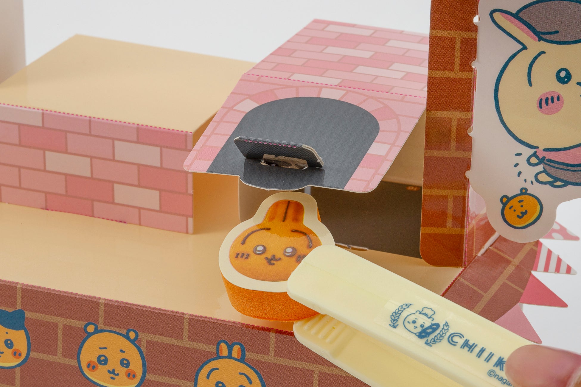 「ちいかわベーカリー」で実際に売られているパンの形をしたマスコットや、オリジナルデザインのワゴン、トング、トレー等がついた、本物さながらのパン屋さんごっこセットです。