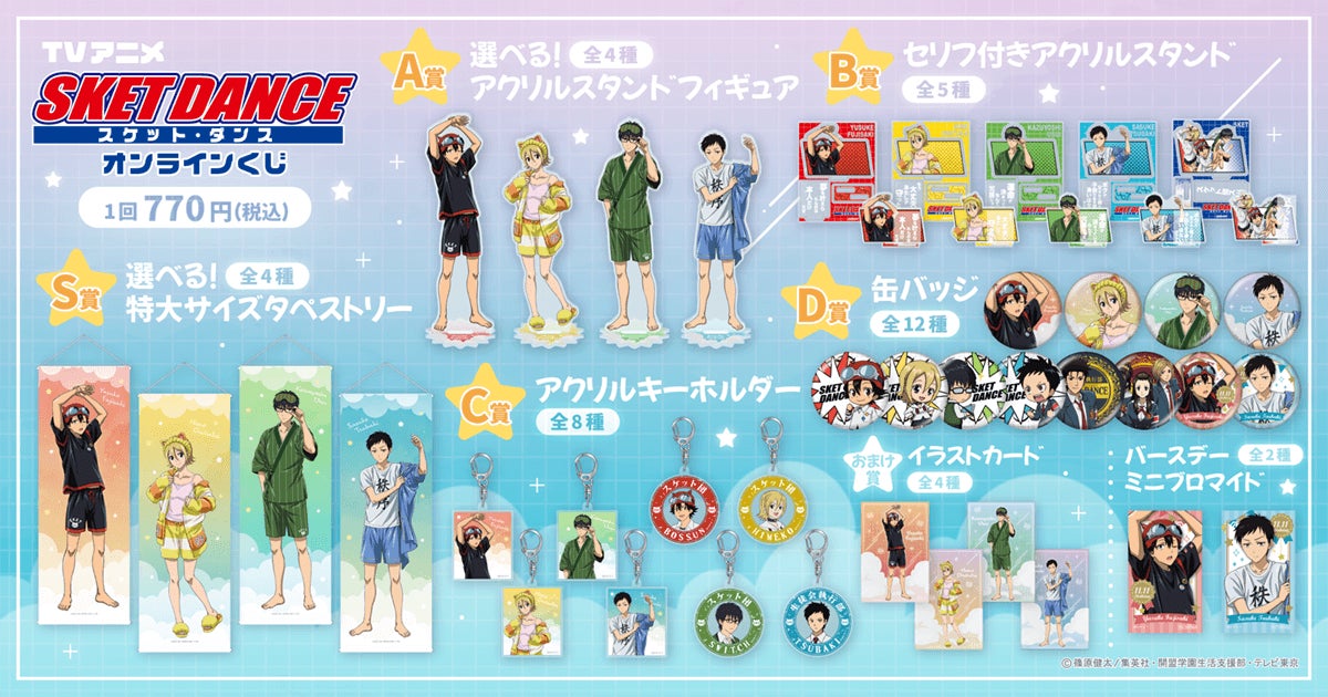 株式会社KADOKAWA(本社:東京都千代田区、取締役 代表執行役社長 CEO:夏野 剛、以下 KADOKAWA)は、運営するオンラインくじサービス「くじ引き堂」において、TVアニメ「SKET DANCE」の豪華賞品が手に入る<TVアニメ「SKET DANCE」オンラインくじ>を、2025年11月6日(木)17時より販売します。
