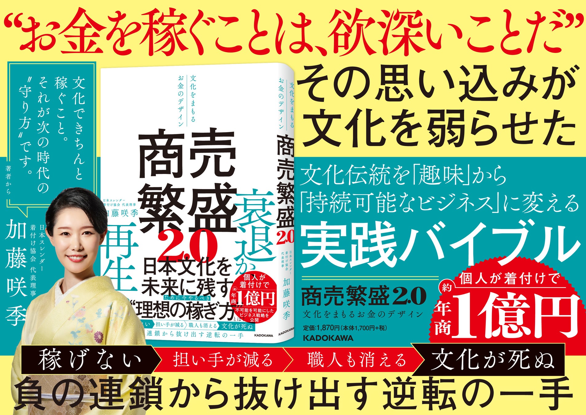 株式会社KADOKAWA(本社:東京都千代田区、取締役 代表執行役社長 CEO:夏野剛)は、延べ2,000人以上が学んだ「スレンダー着付け(R)」を提唱し、年商1億円を達成した加藤咲季氏の新刊『商売繁盛2.0 文化をまもるお金のデザイン』を2025年11月18日(火)に刊行しました。