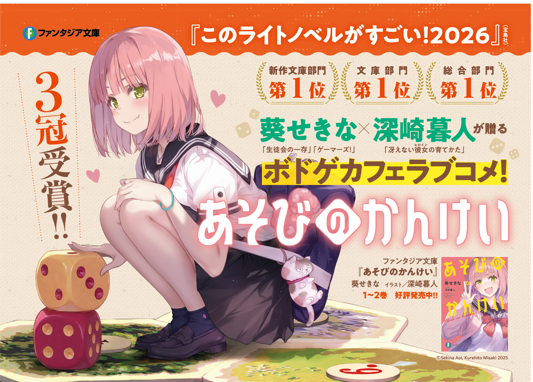ボードゲームカフェを舞台に、登場する彼ら彼女らの誰もが秘密を抱えながら、それでも"あそびのかんけい"を続ける……という複雑な恋愛模様を描いたラブコメである本作。今年5月の1巻発売から話題を集め、この度、ライトノベルガイドブック『このライトノベルがすごい!2026』(宝島社刊)にて、〈総合部門第1位〉〈文庫部門第1位〉〈新作文庫部門第1位〉を受賞いたしました!