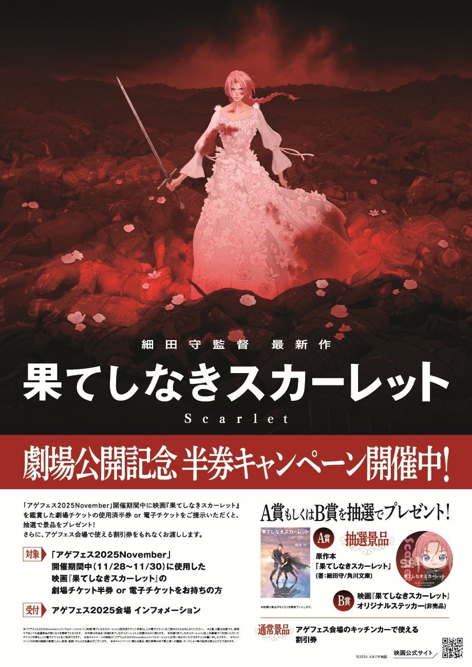 映画『果てしなきスカーレット』の公開を記念し、「アゲフェス2025November」会場にて半券キャンペーンを実施いたします。アゲフェス開催期間中に映画『果てしなきスカーレット』を鑑賞した劇場チケットの使用済み半券もしくは電子チケットをご提示いただくと、抽選で原作本や映画オリジナルステッカー(非売品)などの豪華景品をプレゼントいたします。さらに、「アゲフェス2025November」会場で使える割引券をもれなくお渡しいたします。