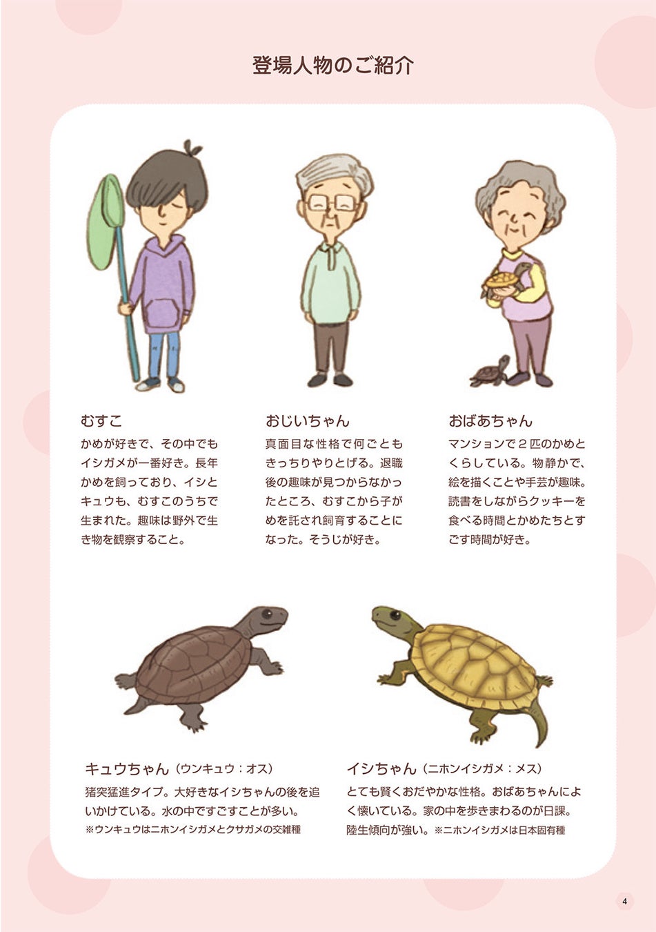 飼育記録を付けるためパソコンを学んだり、かめを気にかけてくれる周りの人たちと交流したり、何気ない日常がほんの少し彩られていく。
