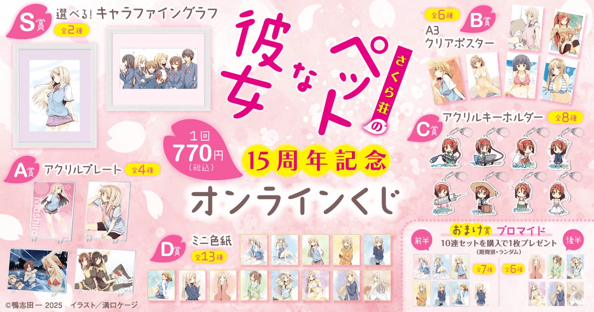 株式会社KADOKAWA(本社:東京都千代田区、取締役 代表執行役社長 CEO:夏野 剛、以下 KADOKAWA)は、運営するオンラインくじサービス「くじ引き堂」において、『さくら荘のペットな彼女』の豪華賞品が手に入る<『さくら荘のペットな彼女』15周年記念オンラインくじ>を、2025年12月11日(木)17時より販売します。