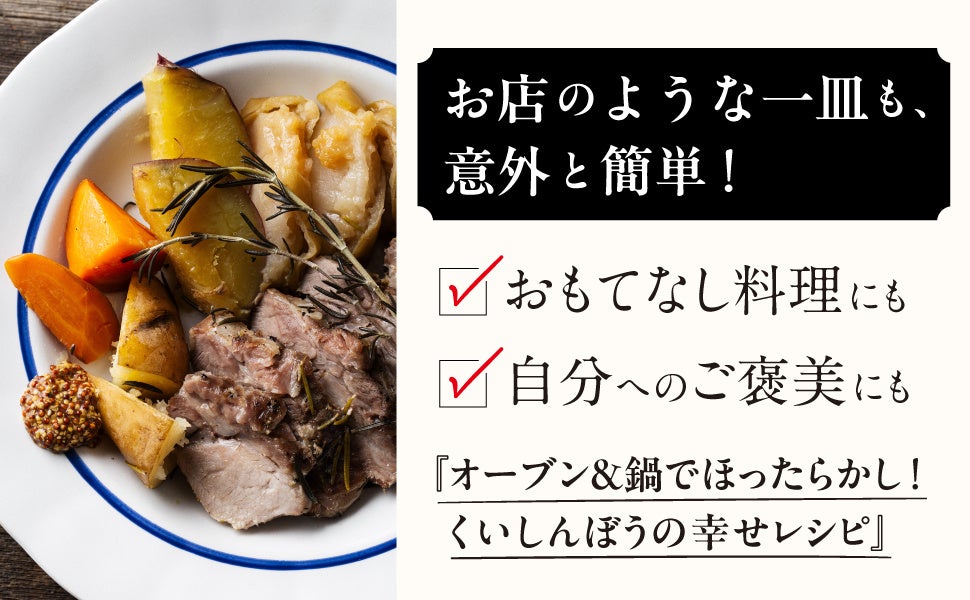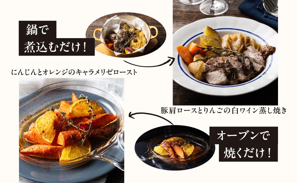 たとえば、一見ハードルが高そうな「豚肩ロースとりんごの白ワイン蒸し焼き」も、たったの3ステップで完成。切って、下味をつけて、あとはオーブンや鍋にお任せ。