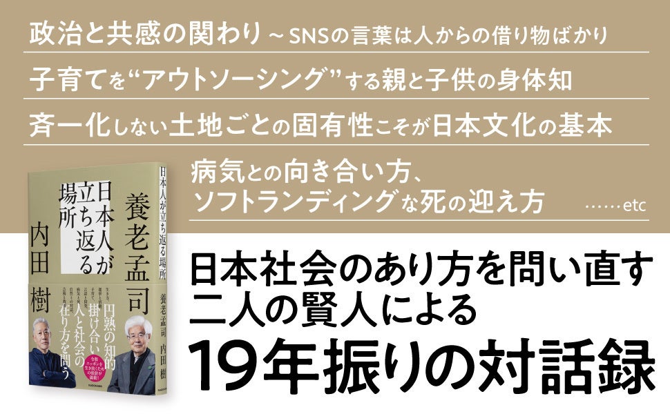 株式会社KADOKAWA(本社:東京都千代田区、取締役 代表執行役社長 CEO:夏野剛)は、2026年1月21日(水)に、460万部を超えるベストセラーとなった『バカの壁』(新潮新書)などの著者である解剖学者の養老孟司氏と、思想家として言論の世界で活躍する内田樹氏の対談本『日本人が立ち返る場所』を発売します。