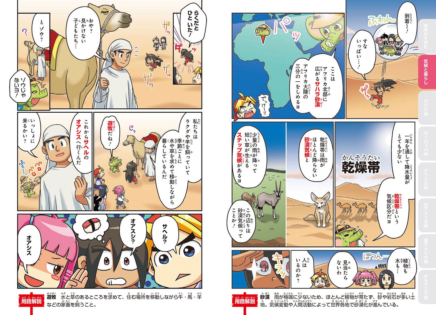 まんがはしっかりと描き込まれた絵とギャグ満載のストーリーで展開。行ったことのない国や地域など、イメージしづらい世界がぐっと身近に感じられます。