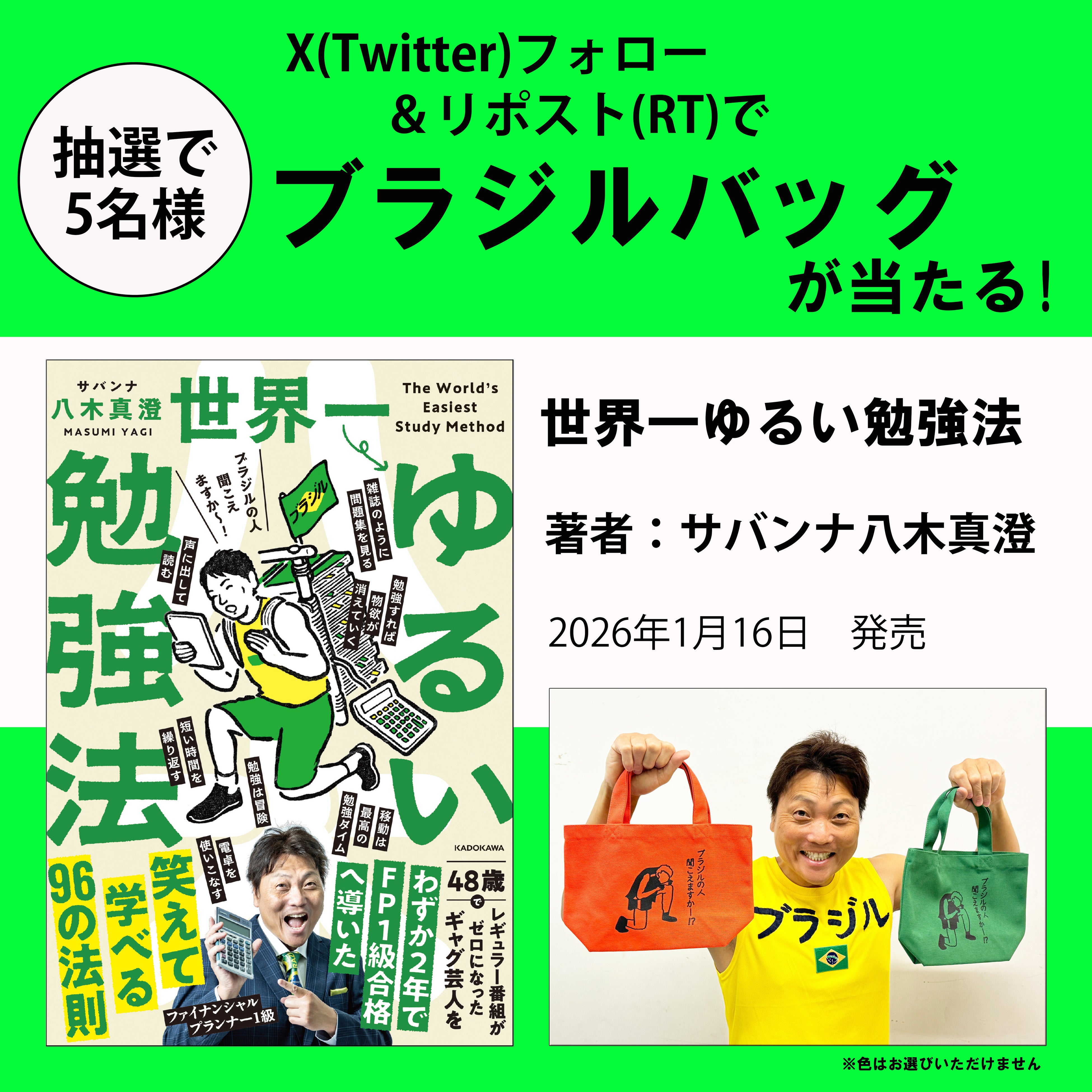 「ブラジルの人聞こえますか~!」のギャグでおなじみ、2024年には難関国家資格・FP1級にも合格したサバンナ八木真澄が、自ら編み出した最強の勉強法を綴った最新刊『世界一ゆるい勉強法』が2026年1月16日(金)に発売。これを記念して、1月16日(金)正午よりXにてブラジルバッグプレゼントキャンペーンを行います。