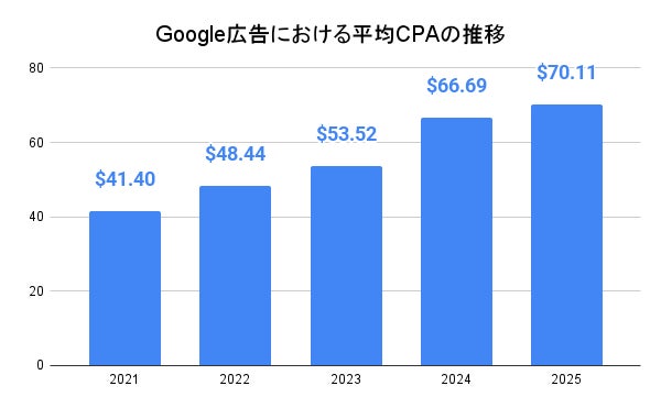 特にGoogle広告の平均顧客獲得単価(CPA)は、2023年から2024年には+24%、2024年から2025年には+5.13%と右肩上がりに増加しています。(WordStream「Google Ads Benchmarks 2025: Competitive Data & Insights for Every Industry」)