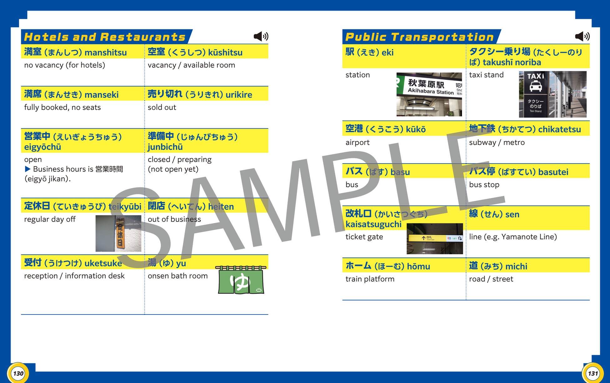 レストランやお店、旅館など、旅行ですぐに使えるフレーズを厳選。日本語が全く分からなくても、英語の解説でスムーズに理解できる構成です。