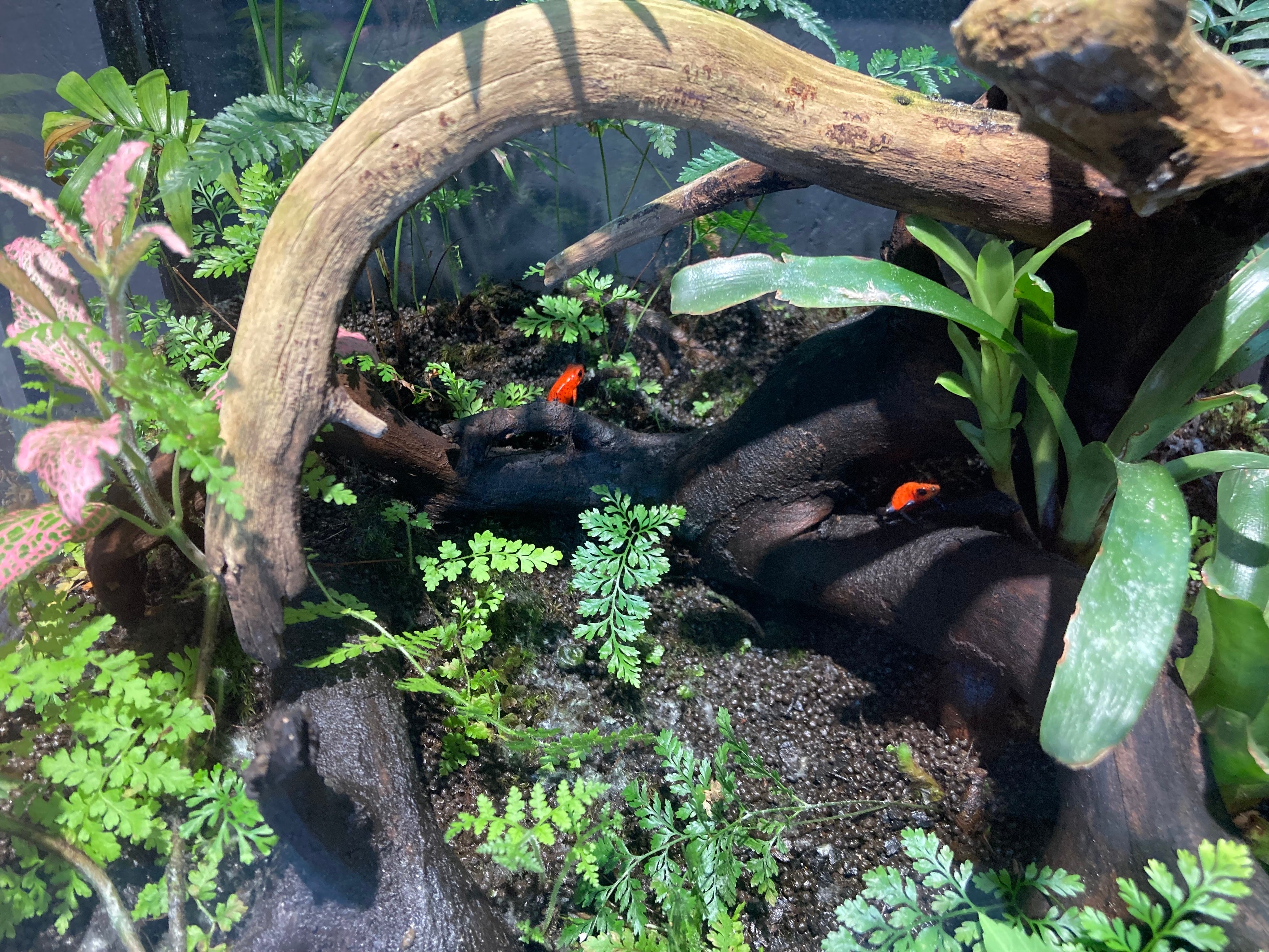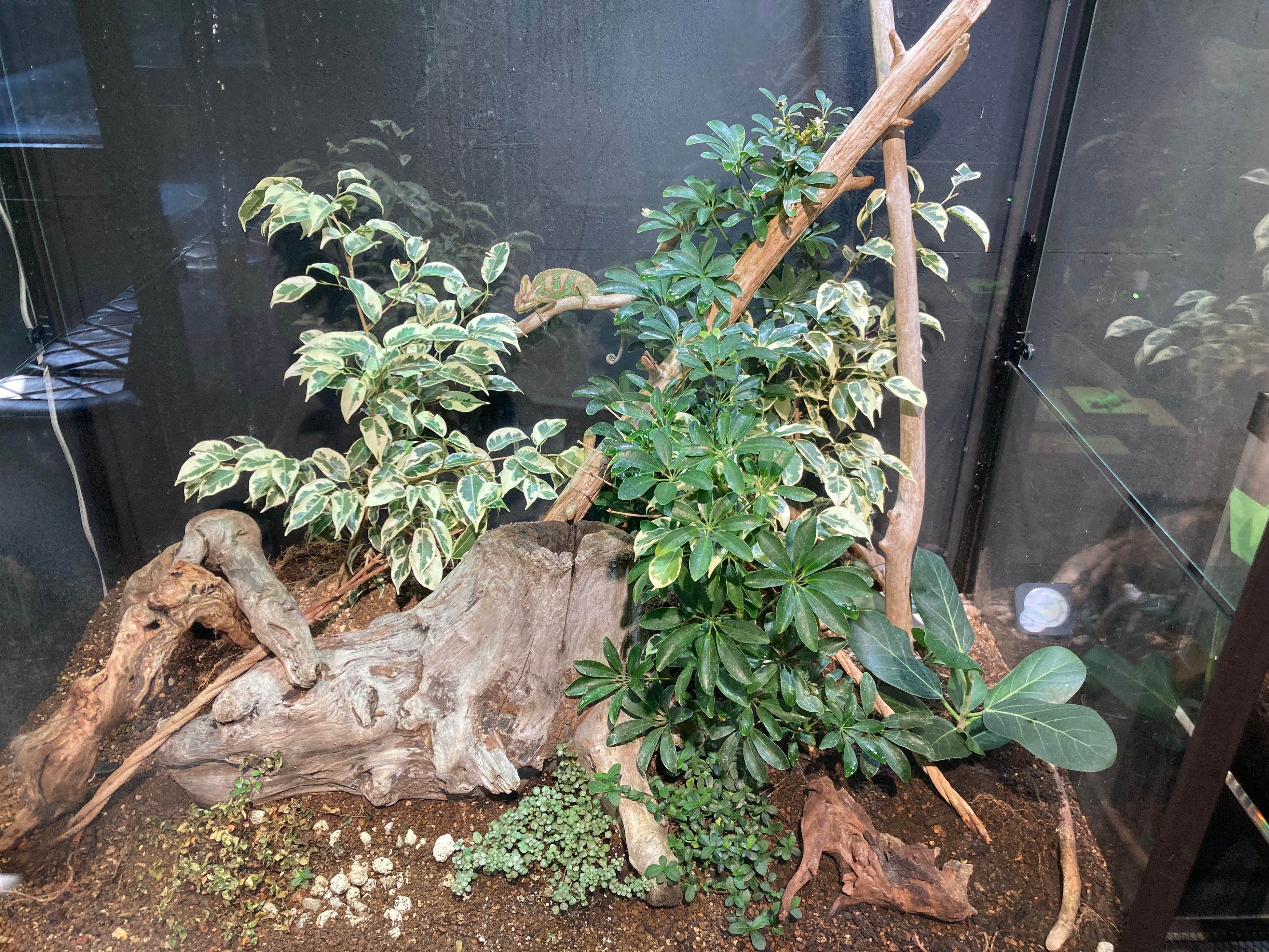は虫類などの生息環境を再現した飼育展示空間「ビバリウム」、流木を使ってガラス容器の中に陸上の自然環境を再現する「熱帯雨林テラリウム」ほか、動物たちを生きている環境も含めて展示。