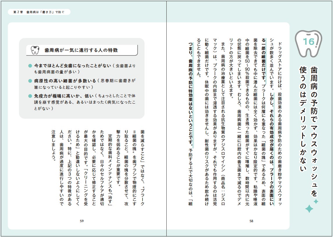 虫歯や歯周病ができてから歯医者で治療を受けることは、実は対症療法であり根本的な解決にはなりません。虫歯を防ぎたければ歯磨きよりも食べ方を変える、1日1回自分で丁寧に歯を磨くといった、病気が発生する原因を理解した上でのセルフケアが一番大切です。「名医を探す」のではなく、「自分で守る」というマインドに変わり、どうすればいいのか具体的な方法を知ることができる一冊です。