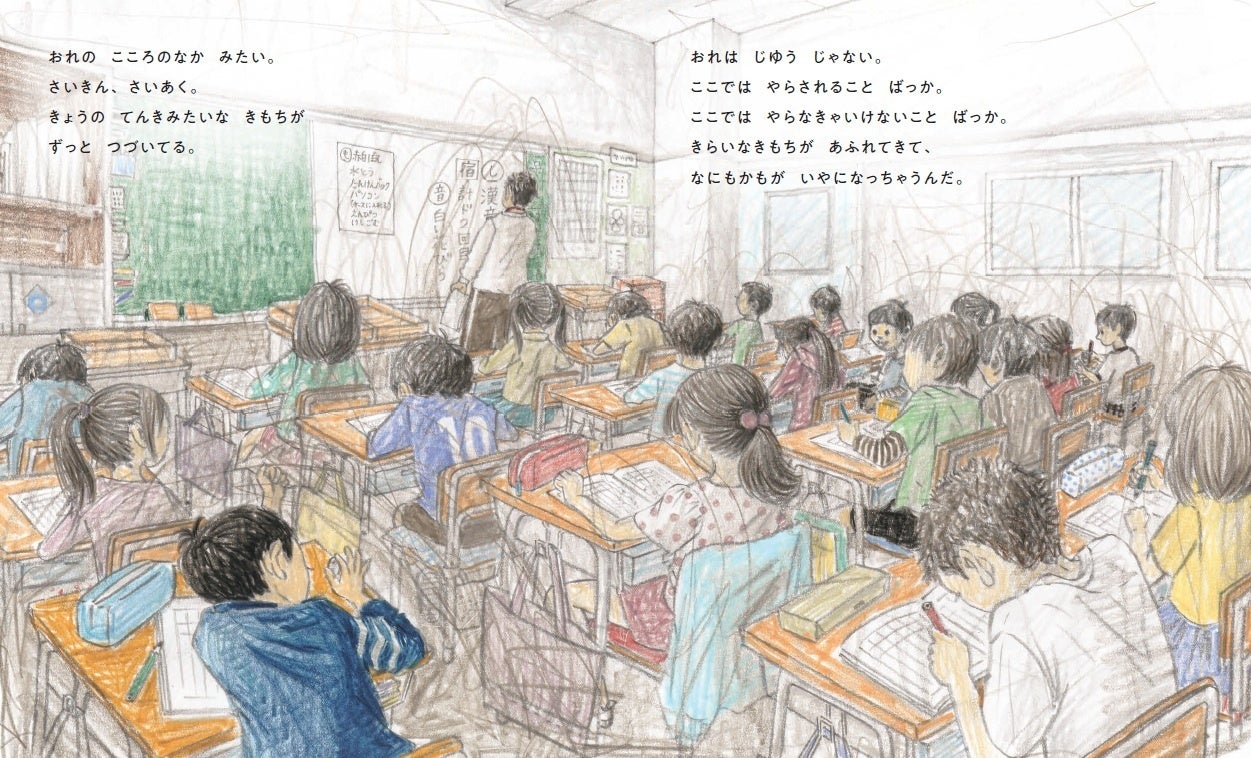 学校、友だち、毎日のこと。やらされることばかりが重なり、「おれは じゆうじゃない」と感じている少年。
