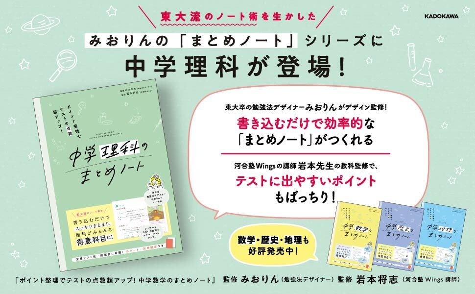 株式会社KADOKAWA(本社:東京都千代田区、取締役 代表執行役社長 CEO:夏野剛、以下KADOKAWA)は、2026年2月19日(木)に『ポイント整理でテストの点数超アップ! 中学理科のまとめノート』(監修:みおりん、岩本将志)を発売いたしました。