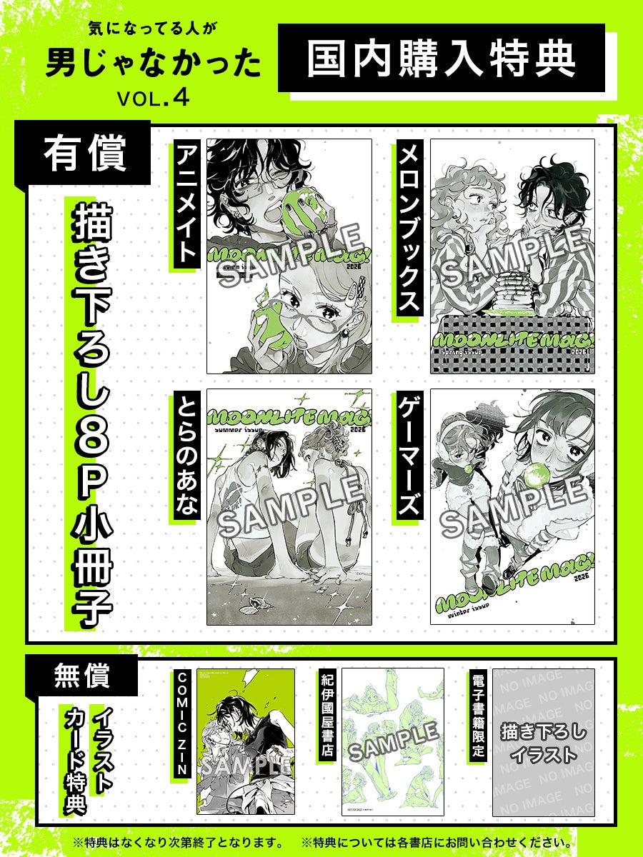 第4巻では、アニメイト、ゲーマーズ、とらのあな、メロンブックスにて、豪華描き下ろし8P小冊子を有償特典として実施。ほか紀伊國屋書店やCOMIC ZINでイラストカード特典も実施されます。