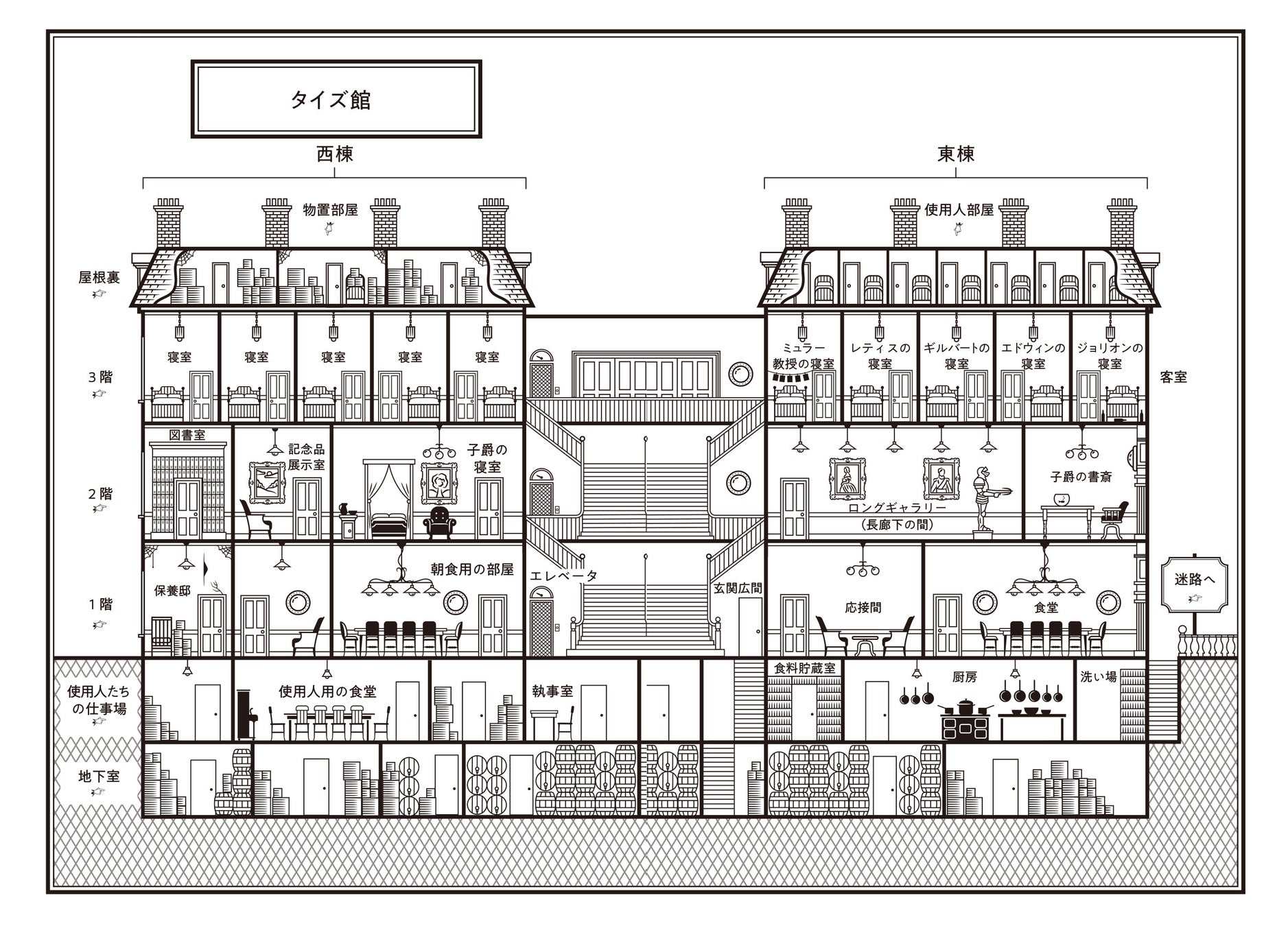 本書の冒頭で、ハレー彗星の館=タイズ館の見取り図が掲載されています。そちらに関してもご紹介しましょう。