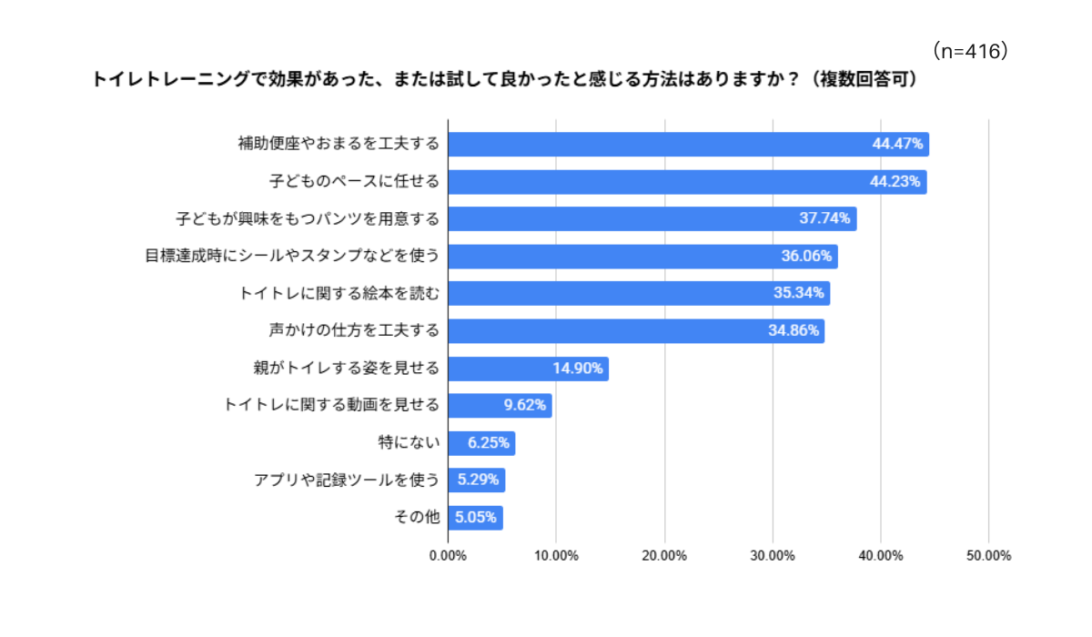 様々な情報を得ながら、試行錯誤してきた先輩ママ・パパも多いはず。 経験者が「効果があった、または試して良かった」と回答した方法にはどんなものがあるのでしょうか。1位は「補助便座やおまるを工夫する(44.47%)」、2位が「子どものペースに任せる(44.23%)」で、ほぼ同率という結果になりました。自由回答にも、「ふさわしい年齢になるとトイレトレーニングをした方が良いというプレッシャーが辛かった。第一子のトイレトレーニングがなかなか進まず、かなり時間がかかりストレスだった。第二子以降はその経験を活かして、本人のペースに合わせることで、少ないストレスで進めることができた。」「年少になってもおむつだった為、周りの子に影響されてトイレに行くようになった。親がいくら頑張っても子供のやる気がないと進まないので、子供には子供のペースがあるんだなと勉強になった。」など、お子さんのペースを大切にしたことで上手くいった、お子さんのペースを大事にしてあげるべきだった、という声が多く寄せられました。