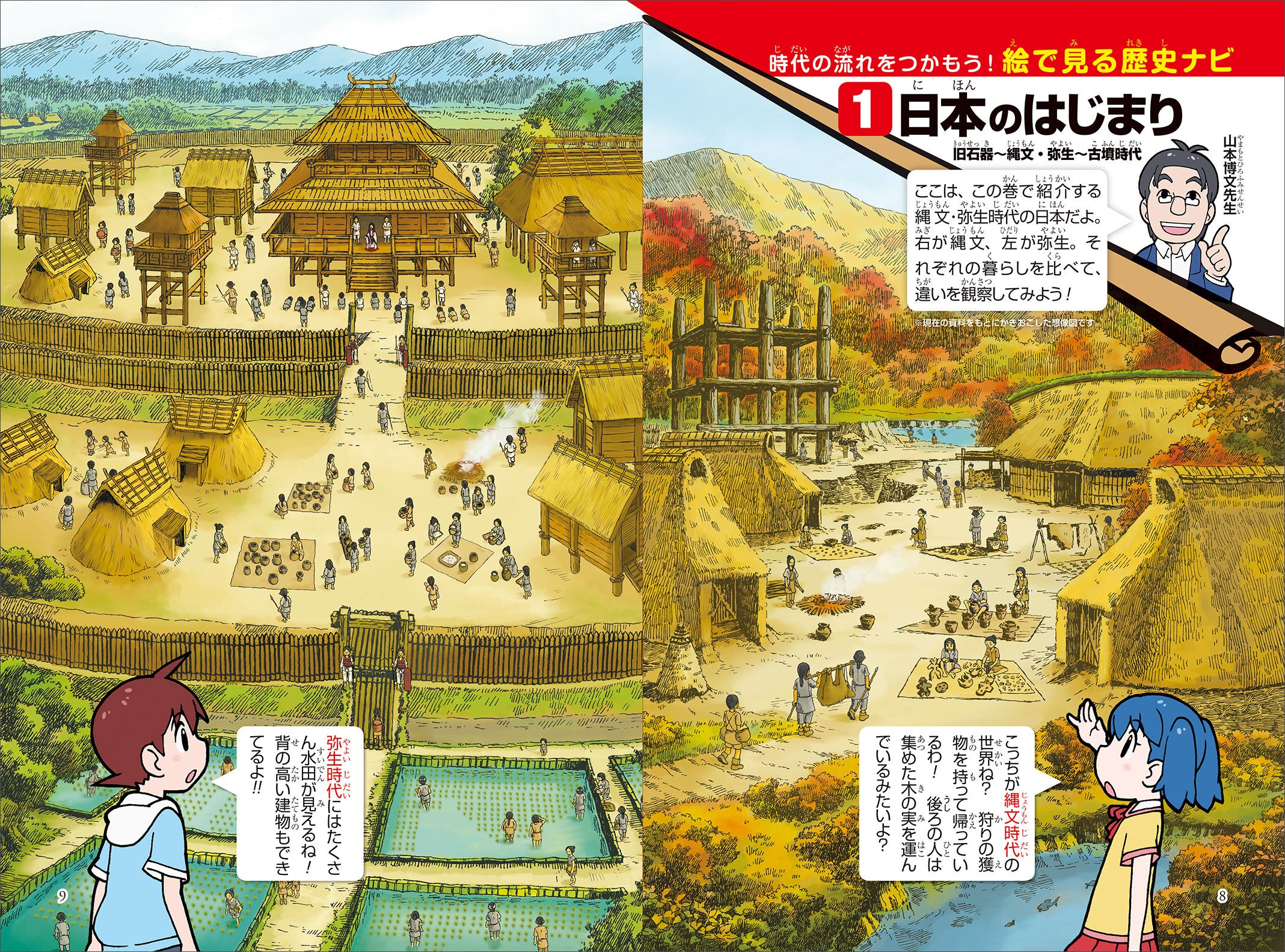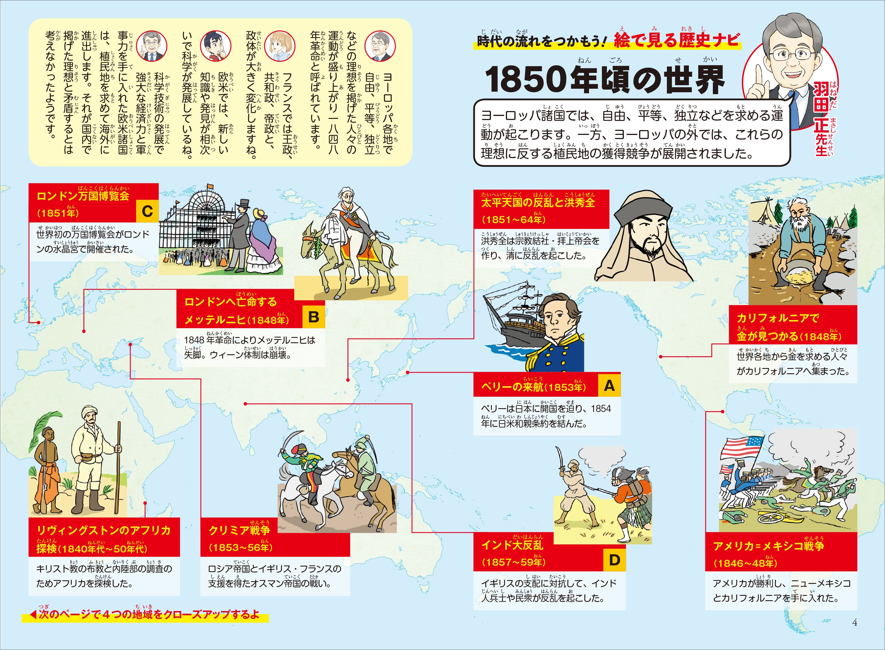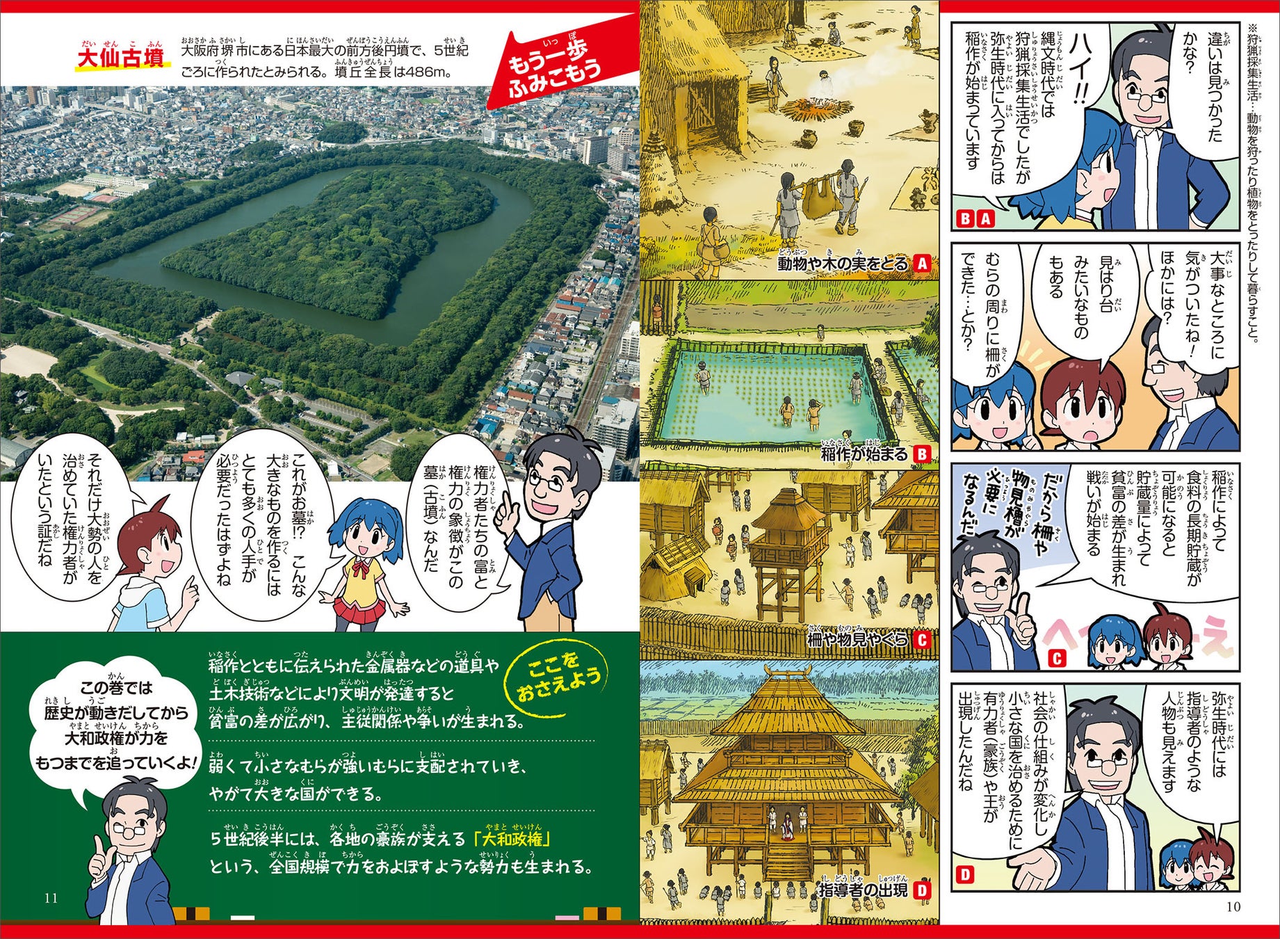 当社オリジナルの構成として、歴史まんが本編を読む前にその時代の特徴がひと目でわかるイラストページを掲載しています。さらに、4コマまんがで時代の移り変わりをわかりやすく解説。