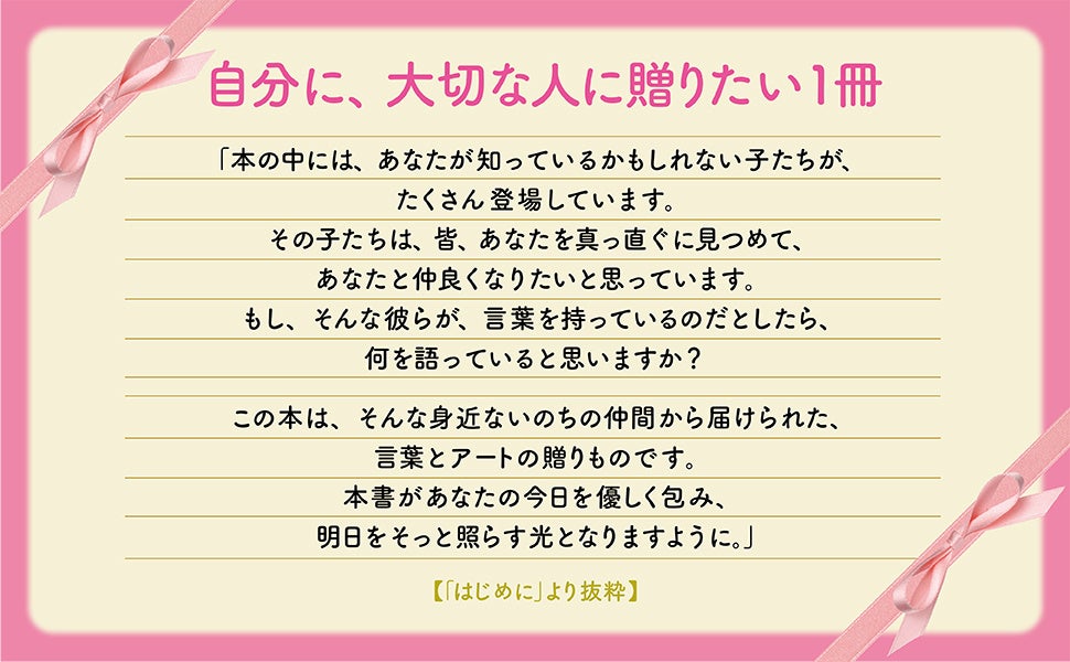新生活が始まり、新しい一歩を踏み出すこの時期だからこそ、がんばっている人へ――あなたはそのままで大切な存在であることを伝え、応援し寄り添うメッセージたち。やさしいアートと言葉で、愛を届けてくれる1冊です。