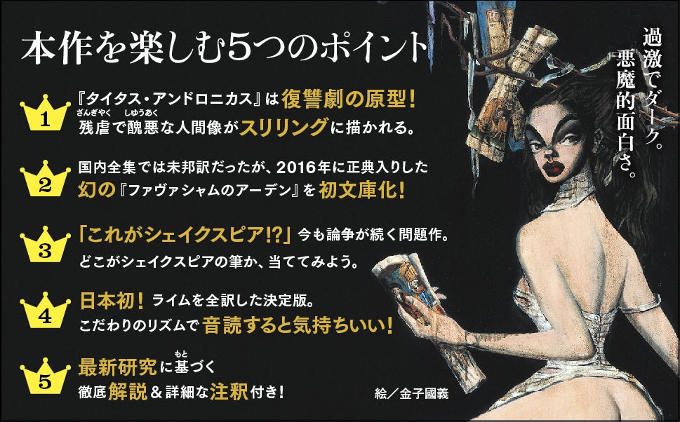 過激でダーク。悪魔的面白さ。吉田鋼太郎氏推薦。復讐劇の元祖「タイタス」と、日本初の文庫化&幻の作品「アーデン」を収録