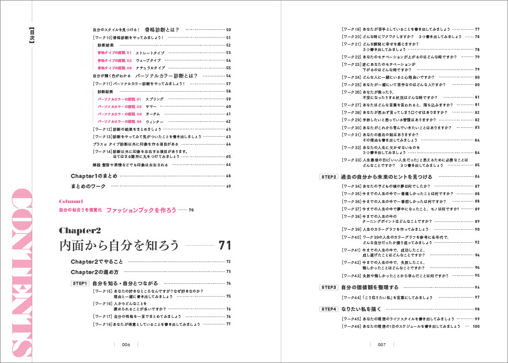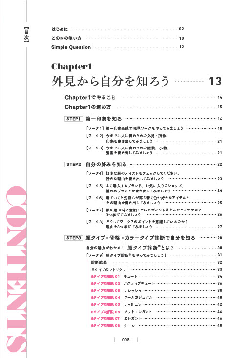 日本で初めて「顔タイプ診断(R)」を考案した創始者・岡田実子が提案する「自分磨きノート」では、外見と内面を分析し、自分を磨く65のワークを収録しています。