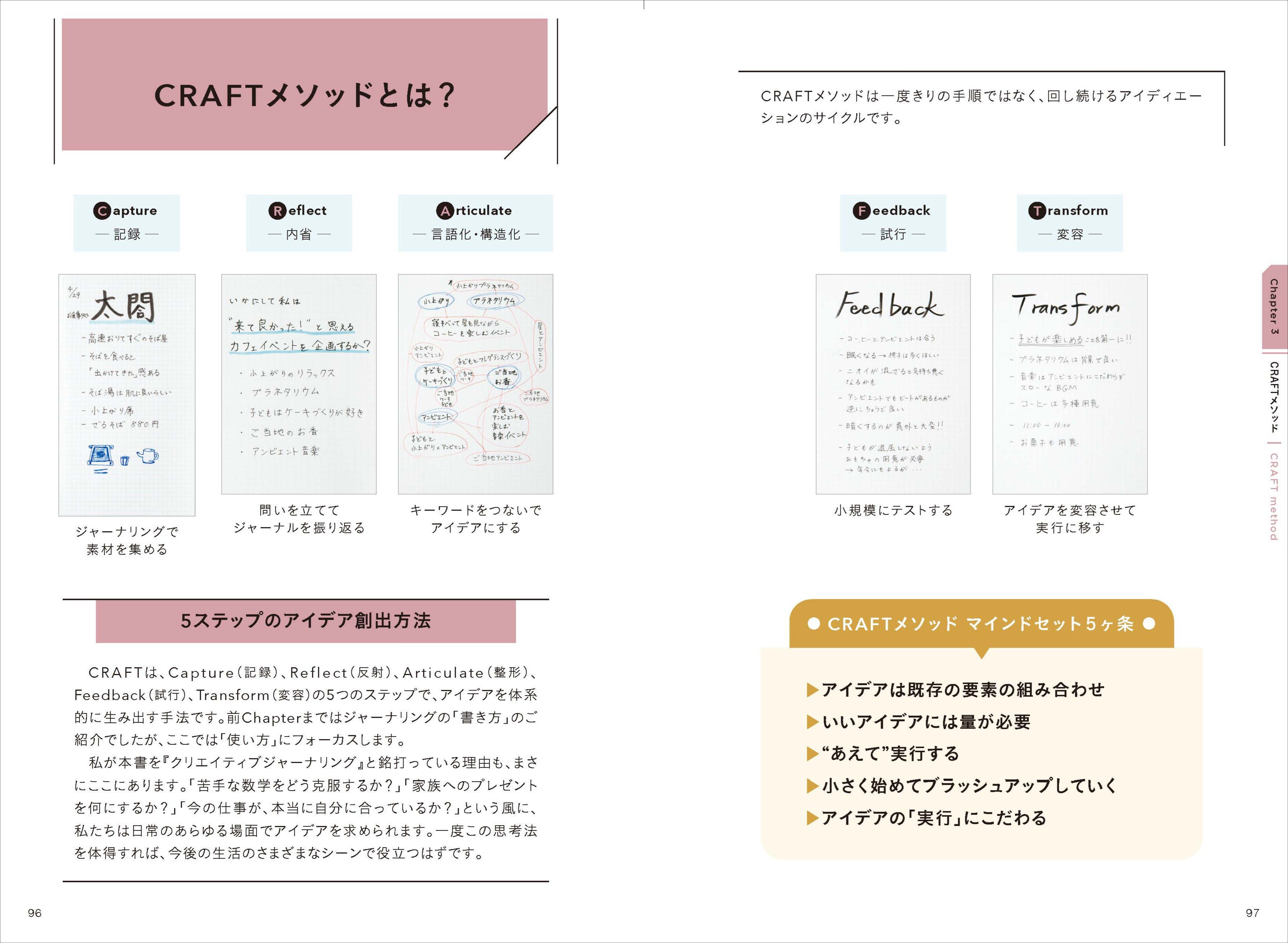 今まで書き溜めたデイリーログを振り返って5つのステップでアイデアを生む方法、「CRAFTメソッド」を詳細に解説しています。何気ない日常にヒントがあったことに気づける、まったく新しいジャーナリング法です。
