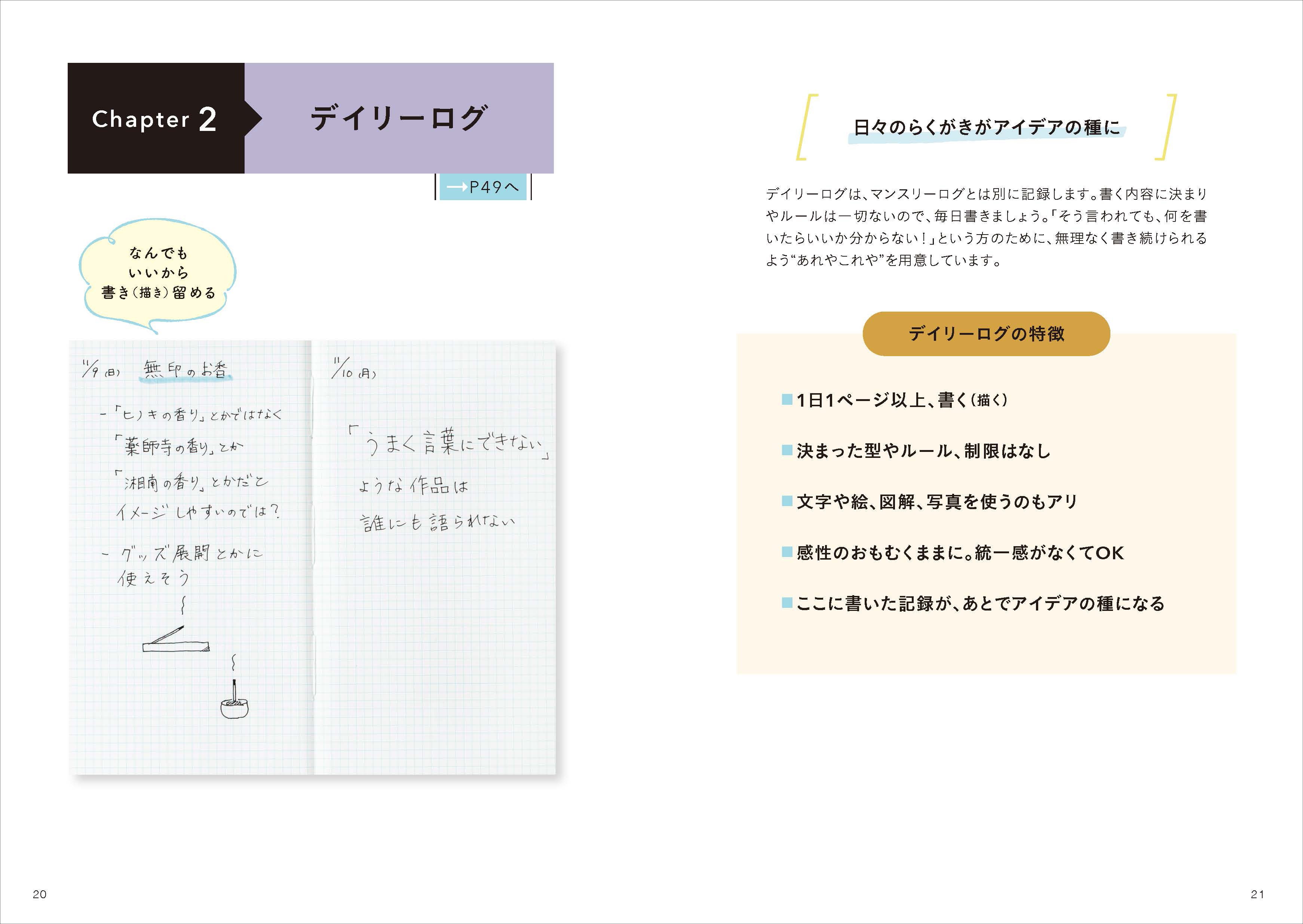 さらに、日常にあふれる気づきを、ノートを通じて“価値あるアイデア”へと変える具体的なメソッドを体系化。いくつかの簡単なステップを踏めば、日々の記録が、次の企画や価値あるひらめきに変わっていきます。