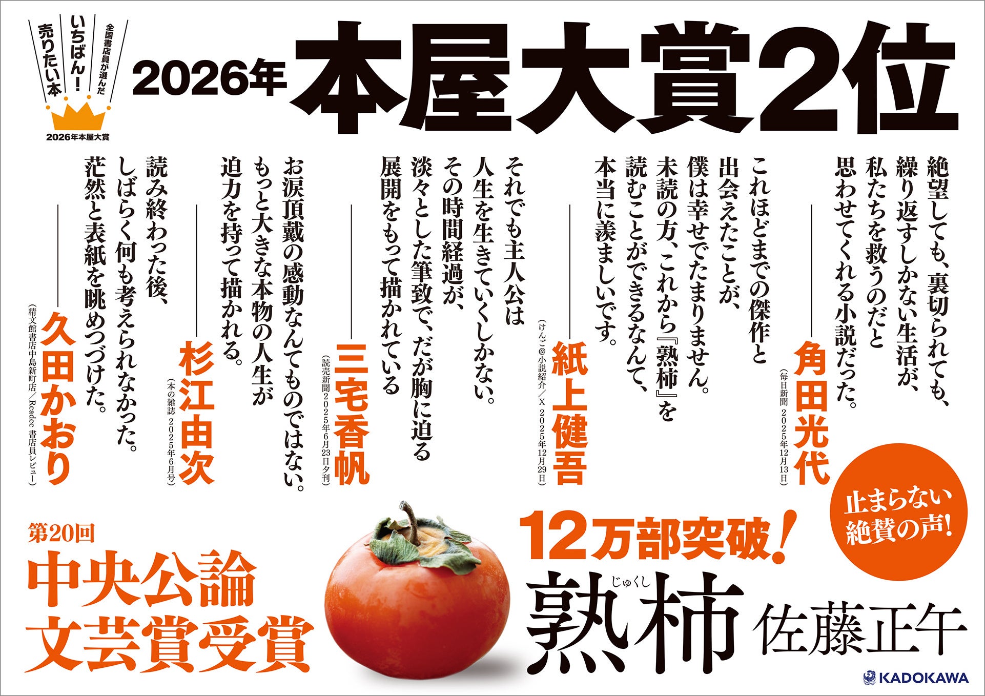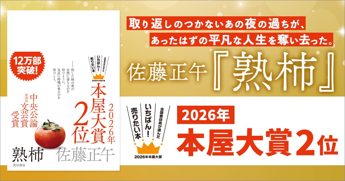 本日2026年4月9日(木)、明治記念館にて「全国の書店員が選んだ いちばん!売りたい本 2026年本屋大賞」の発表会が開催され、佐藤正午『熟柿(じゅくし)』が第2位に決定しました。