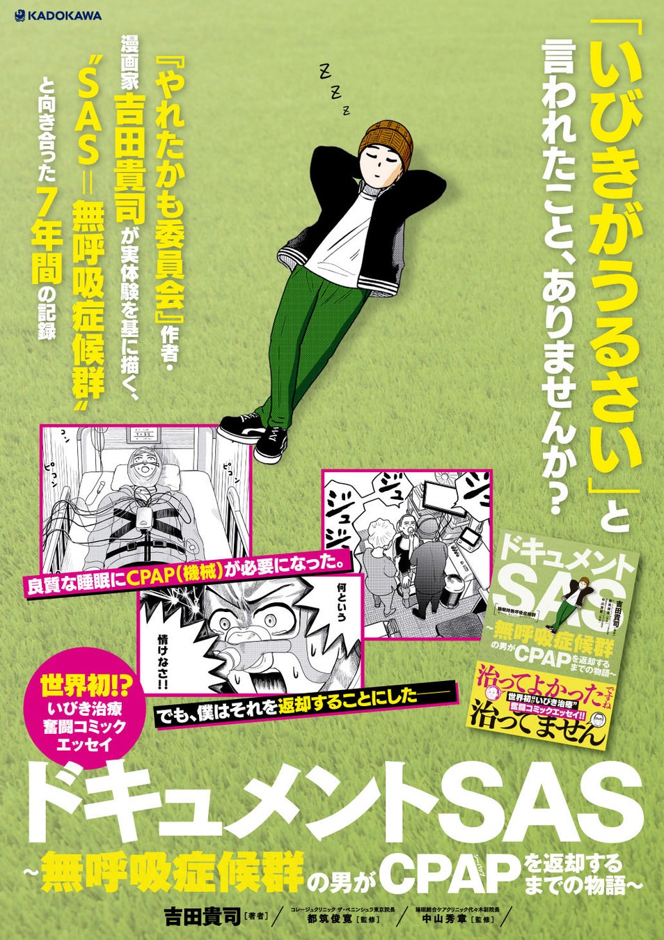株式会社KADOKAWA(本社:東京都千代田区、取締役 代表執行役社長CEO:夏野 剛)より、コミックエッセイ『ドキュメントSAS~無呼吸症候群の男がCPAPを返却するまでの物語~』(著者・吉田貴司、監修・都筑俊寛、中山秀章)が絶賛発売中です。本日4月17日(金)より、漫画サイト「カドコミ」、「ニコニコ漫画」にて期間限定の試し読み増量を開始いたしました。