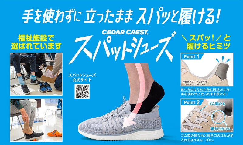 靴べらのようなかかと形状で、手を使わずに立ったまま「スパッと!」履ける、画期的なシューズです。メンズ・レディース・キッズと幅広いラインナップを取り揃えております。
