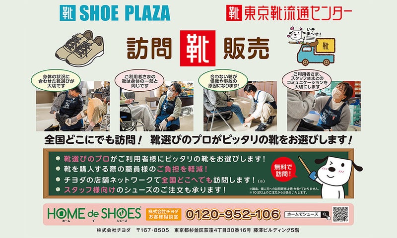 株式会社チヨダの靴の訪問・出張販売サービスです。全国の「東京靴流通センター」「シュープラザ」店舗から、障害者支援施設・老人ホームなどの社会福祉施設に訪問して、施設利用者様の靴のフィッティング、販売をしています。