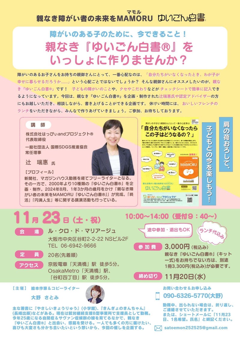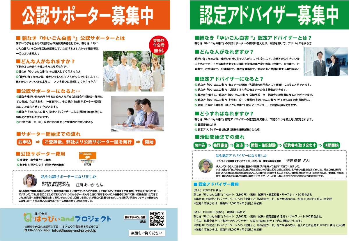 モニターになっていただいた方々からのご紹介で、障がいのお子様をおもちの親御様たちの家族会や就労支援施設等よりお声をかけていただき、親なき『ゆいごん白書®』を使っての講習会や説明会を、11月に4会場(神戸市・大阪市2か所・大阪府松原市)で開催します。