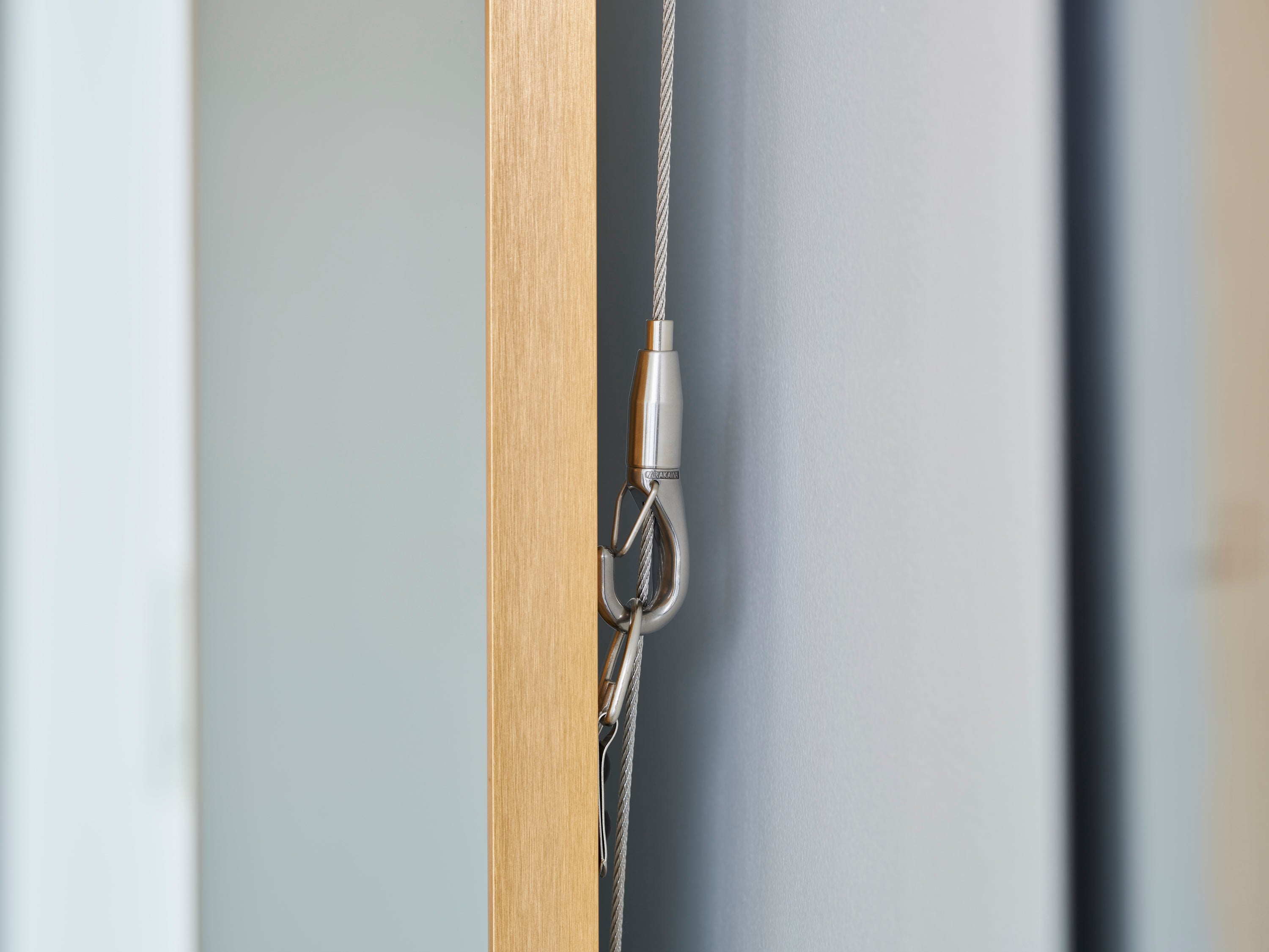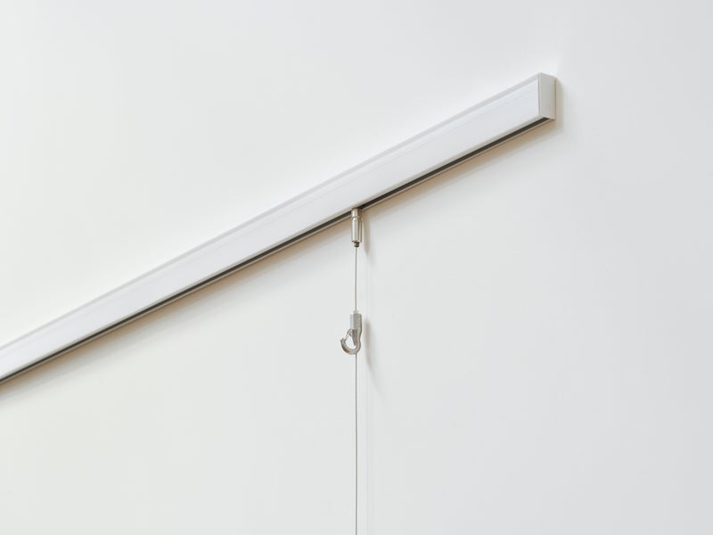 カーテンレールが派生したアルミ製のレールからワイヤーを垂らし、ワイヤーグリップ機構を備えたフックで絵画等の対象物を吊り下げることができるシステム。当社が開発したワイヤーグリップがあることで誕生したシステムで左右、上下に簡単に移動することができます。