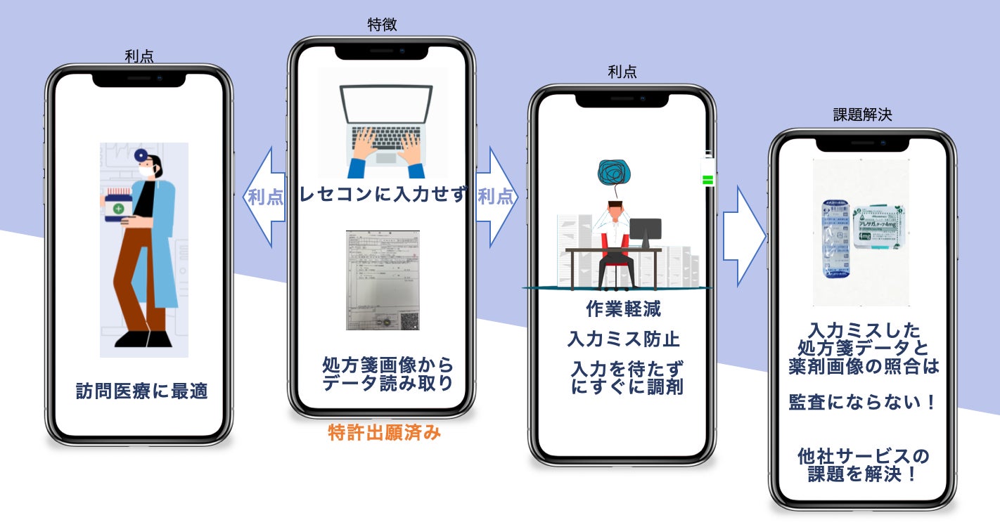 処方せんのQRコードで処方せんの情報を読み取り、薬剤の画像をスマホで撮影して、薬剤の名前を読み取り処方せんの情報と照合するAI搭載アプリです。レセコン連携が必要ないため、薬局の外でも使え、在宅医療や、病院の医師・看護師もみんなで連携して使えるように、バージョンアップしていきます。