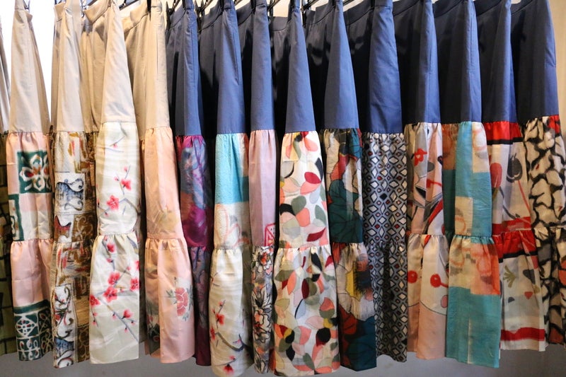 お着物を一つ一つ丁寧にほぐし、着物1着からスカート1着をつくりました。 2段にティアードになっていてシンプル目に可愛らしくもあり上品にまとめています。