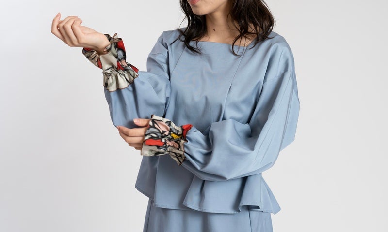 銘仙の発色のいいテキスタイルを袖口・首後ろにワンポイントで取り入れました。鎖骨を見せることですっきりした印象に、女性らしさを引き出します。バックスタイルにはタックを入れ、スタイルアップを演出してくれます。後ろ姿、横からのスタイルでは足を長くみせてくれます。袖口のフリルがキュートなアクセントに。さりげなく文化を楽しんでいただきたいです。