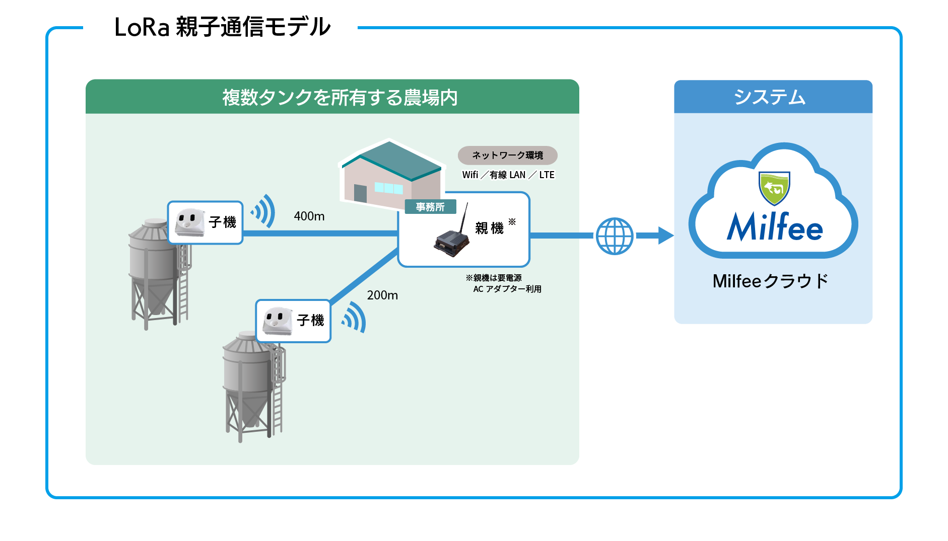 ●飼料タンク残量管理システム「Milfee」LoRa親子通信モデルとは