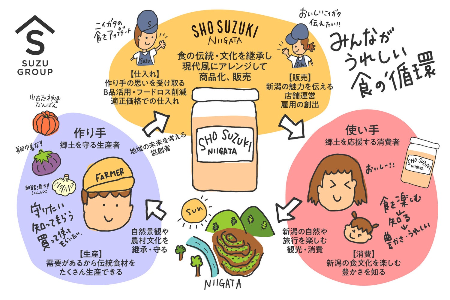 スローフードやガストロノミーの考えを積極的に取り入た活動を続けており、「畑ごはん塾」「やさいの学校」等の地域の魅力を伝えるイベントの企画運営、「SHO SUZUKI NIIGATA」「おむすびジャム」をはじめとする地元食材を生かした商品のプロデュースも多数手がける。