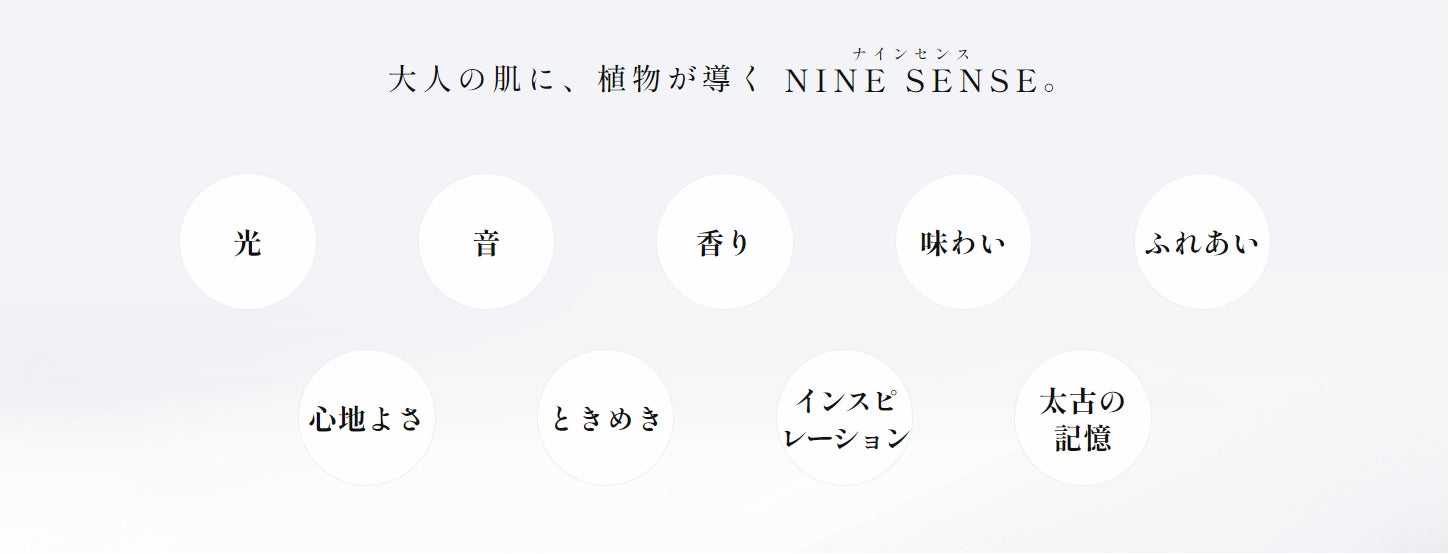 もっちりうるん!が、とまらない。ハリ肌つづく高機能ジェル。その秘密は「3つの3D美容成分」と「3大植物成分」です。ナインセンスだけの多彩な美容成分が、大人肌をハリ・うるおい美肌へと導きます。贅沢なこだわり成分をひとつに。高保湿とシンプルエイジングケアを叶える1つ9役 “ナインインワン”。