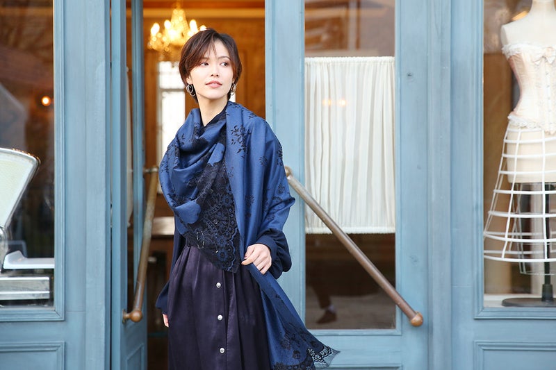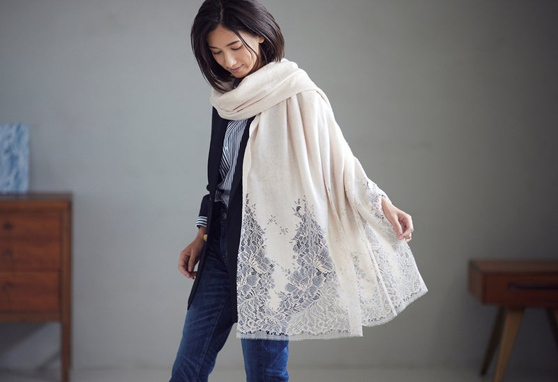 世界でも限られたメーカーしか作れない伝統レース「リバーレース」のデザインと生産技術から生まれた、レースの美しさと柔らかさを備えたふんわり軽くて肌あたりのよいストールです。