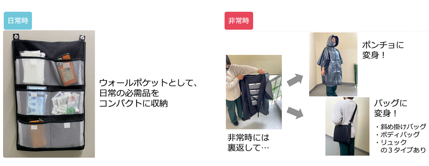 日常時はウォールポケットとして生活に必要なものを入れて使うことができ、災害時にはリュックにして持ち運んだり、防水防寒のポンチョとして使用することができる、3in1の防災便利グッズです。