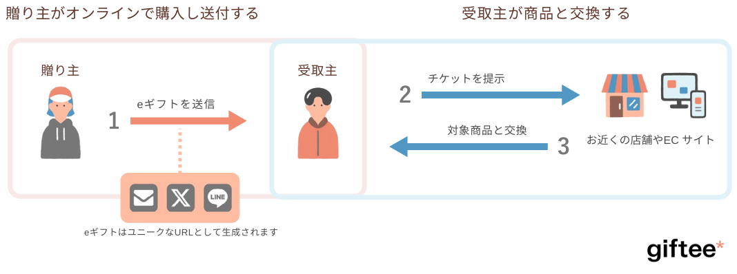eGift Systemは、店頭で引き換えることのできるデジタルのギフトチケットの生成、およびそのギフトチケットを自社サイト上で販売できるシステムです。生成したeギフトは、自社サイトおよびギフティの持つ複数のチャネルを介して、個人、法人、自治体へ向けに流通させることができます。