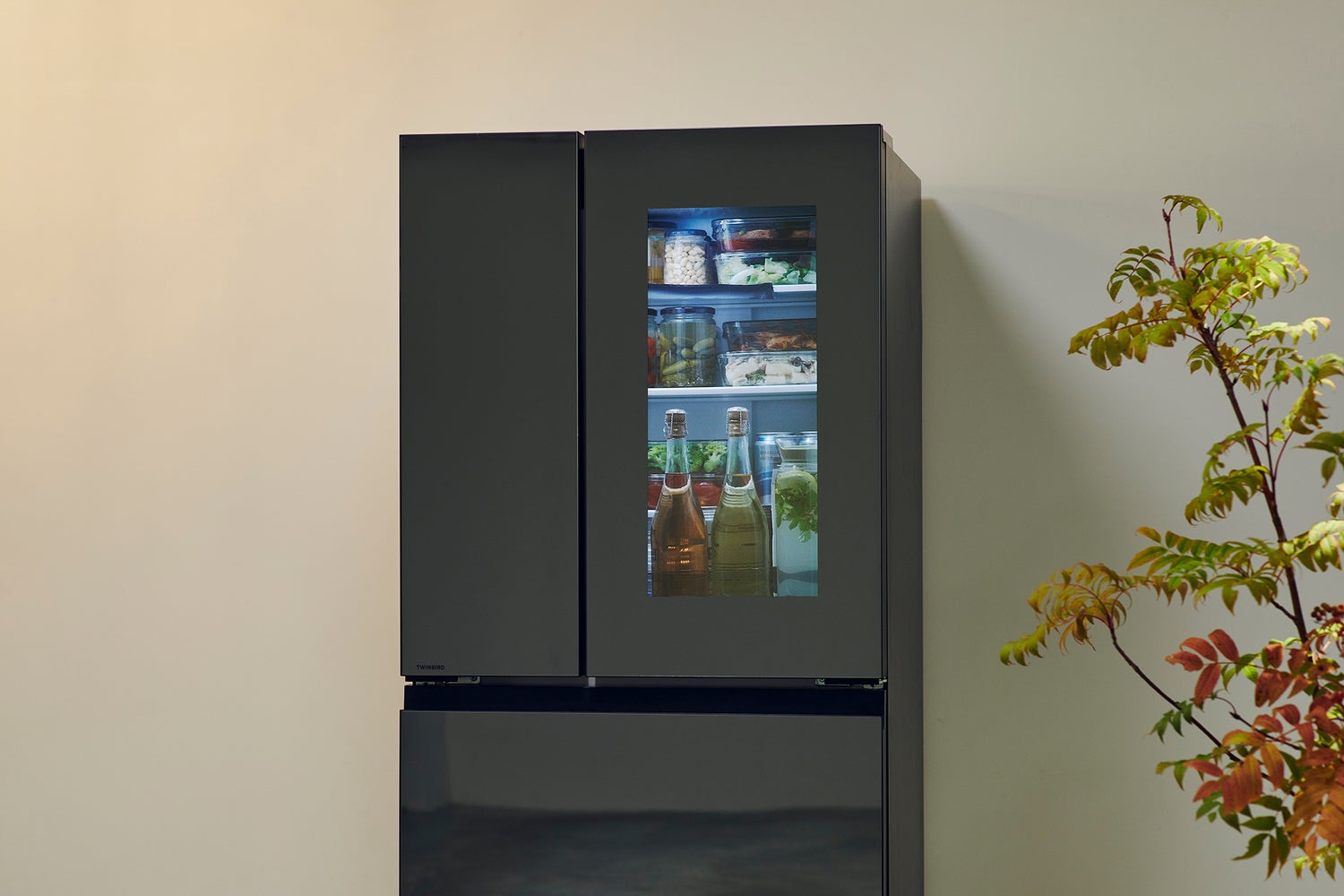 ドアを開けずに中身が見える"タッチアンドビュー"機能を搭載した、ツインバードの「4ドア冷凍冷蔵庫」です。 ドアについたセンサーに軽く触れると、ハーフミラーが透けて、開けずに庫内が確認できます。