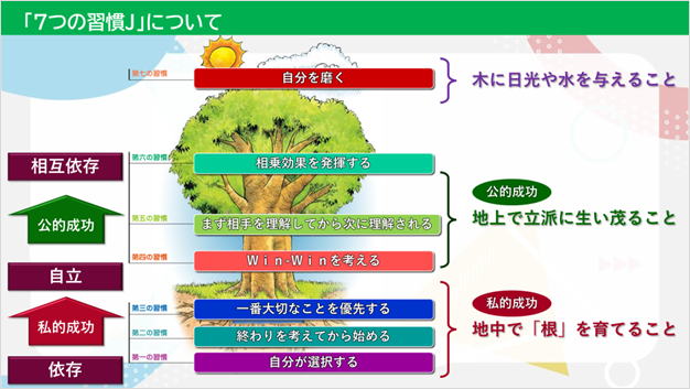 「7つの習慣J®」は、スティーブン・R・コヴィー博士のベストセラー『7つの習慣』を中高生向けに体系化した教育プログラムです。自ら考え主体的に行動する力、仲間と協力し信頼関係を築く力を育むことを目的としています。授業やワークを通じて、人生を自分で選択する意識やリーダーシップを体験的に学び、非認知能力や人間力を伸ばすことができます。これまでに延べ36万人以上が受講しており、学校現場や学習塾などで幅広く活用され、未来を生き抜く力の育成に大きな実績を上げています。