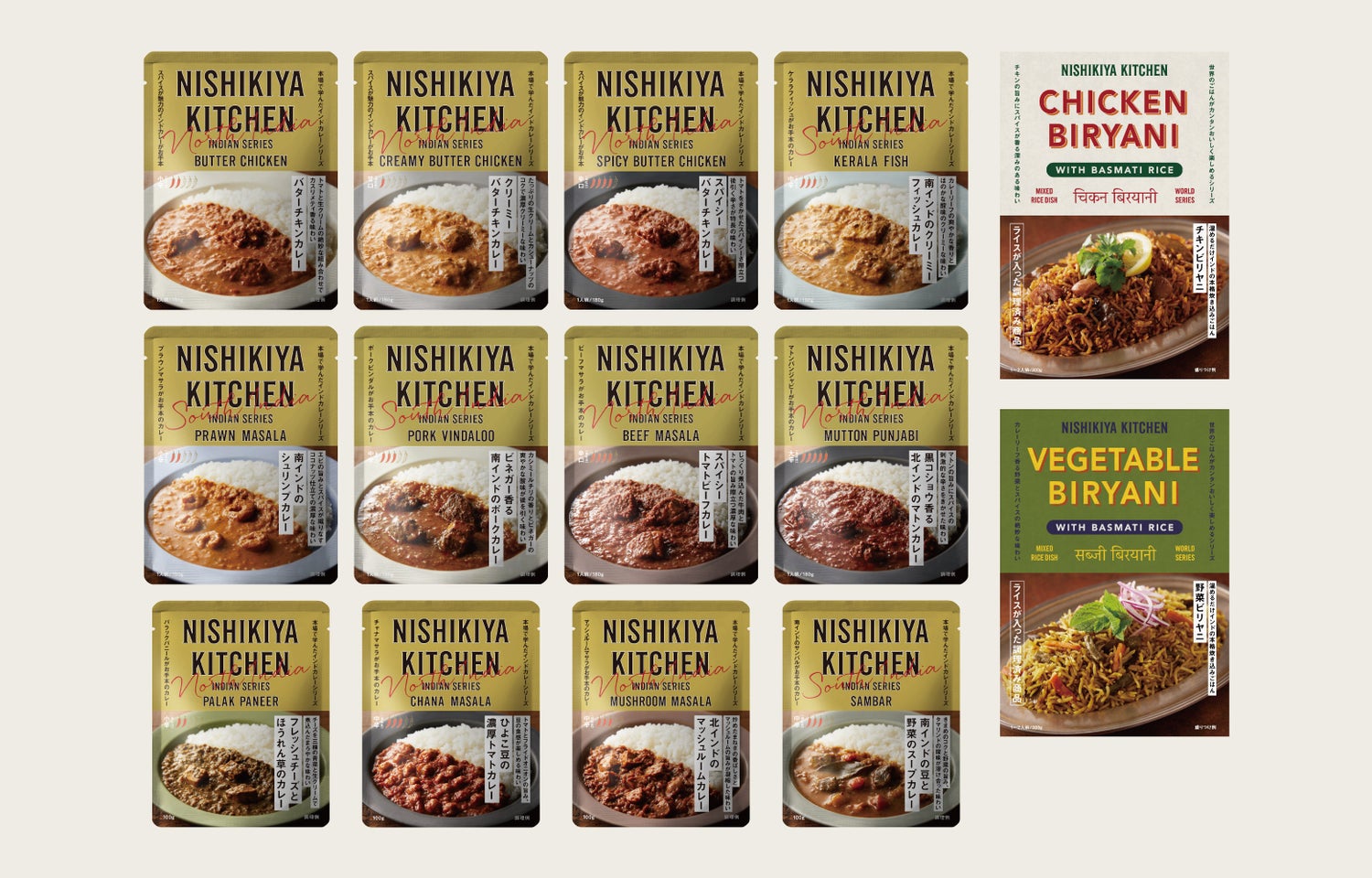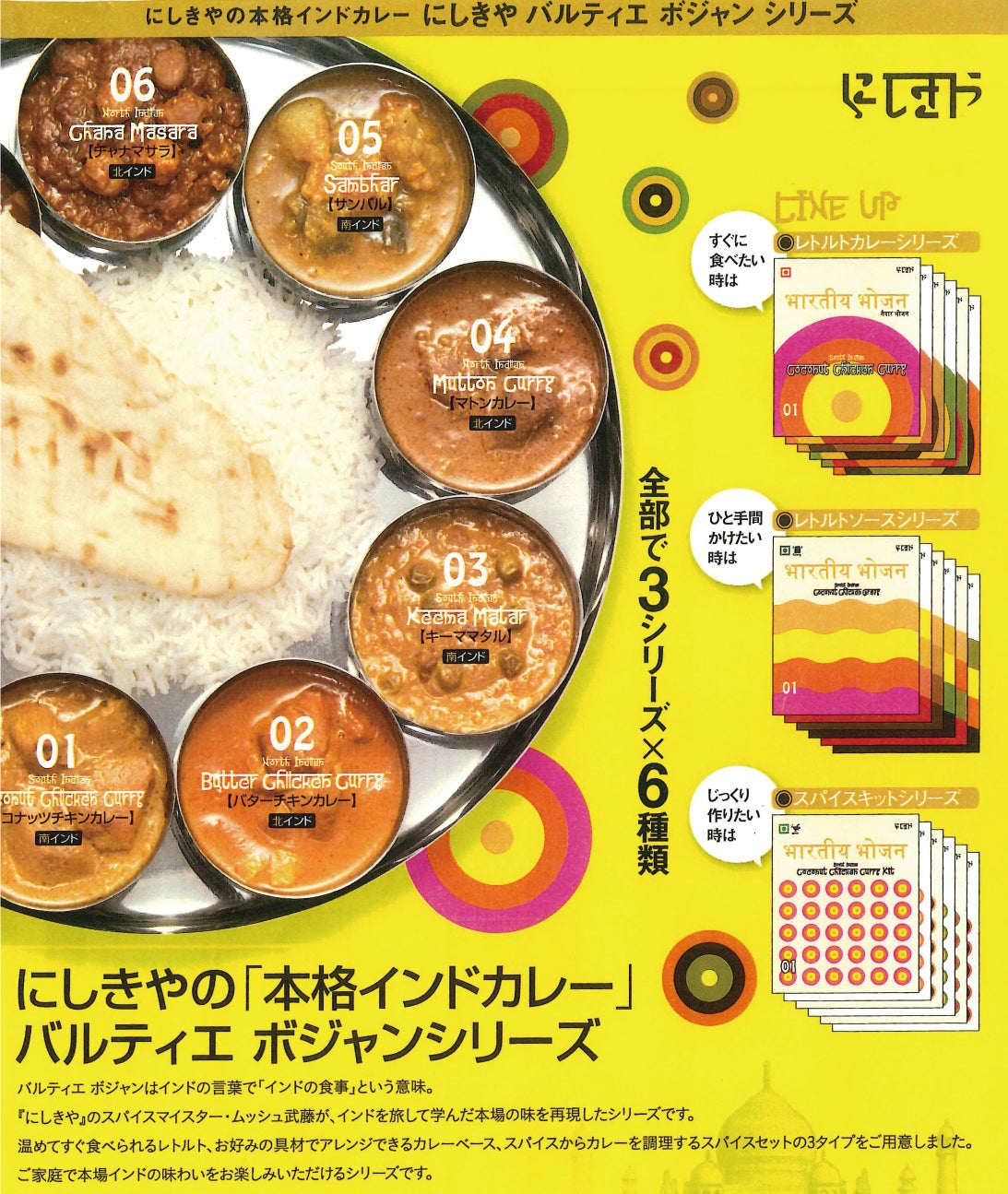 カレーの本場・インドへ20回の渡航、14年かけてたどりついた本格的な味わいで、ニシキヤキッチンを象徴するシリーズ。本場の味づくりに習い、素材やスパイスの使い方や手法(製造工程)を追求し続けて います。