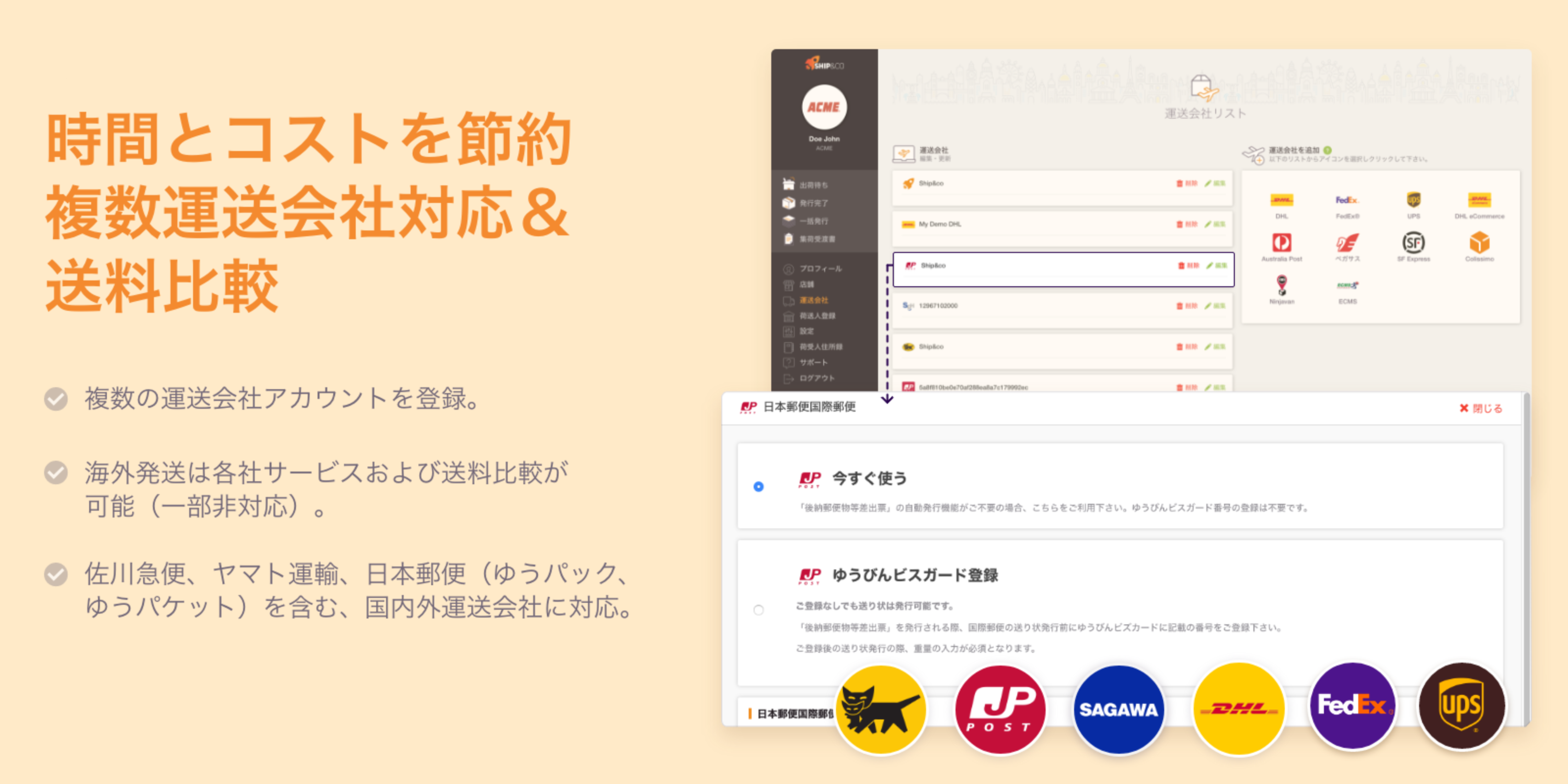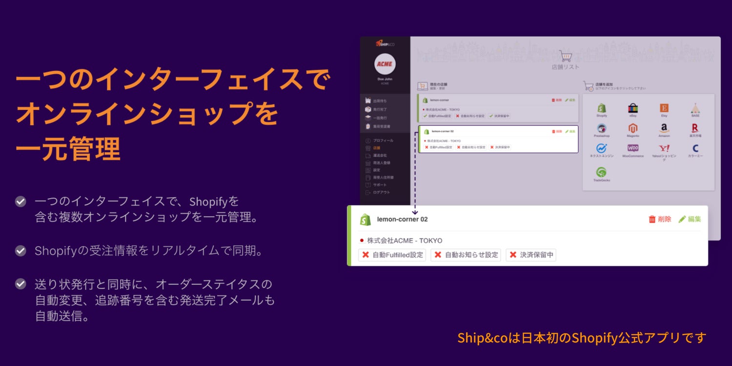 Ship&coは、EC事業者が出荷業務において直面する課題を解決するために開発された送り状発行システムです。シンプルで使いやすいWebアプリならびに送り状発行APIを開発・提供しており、Webアプリでは、EC店舗の注文情報を自動的に同期してFedEx、UPS、DHL、日本郵便 (国際/国内)、ヤマト運輸、佐川急便などでの出荷に必要なラベルを簡単に作成することができます。Ship&coを使うことで、煩雑な手作業を省くことができ、出荷業務の効率化と正確性の向上を実現できます。