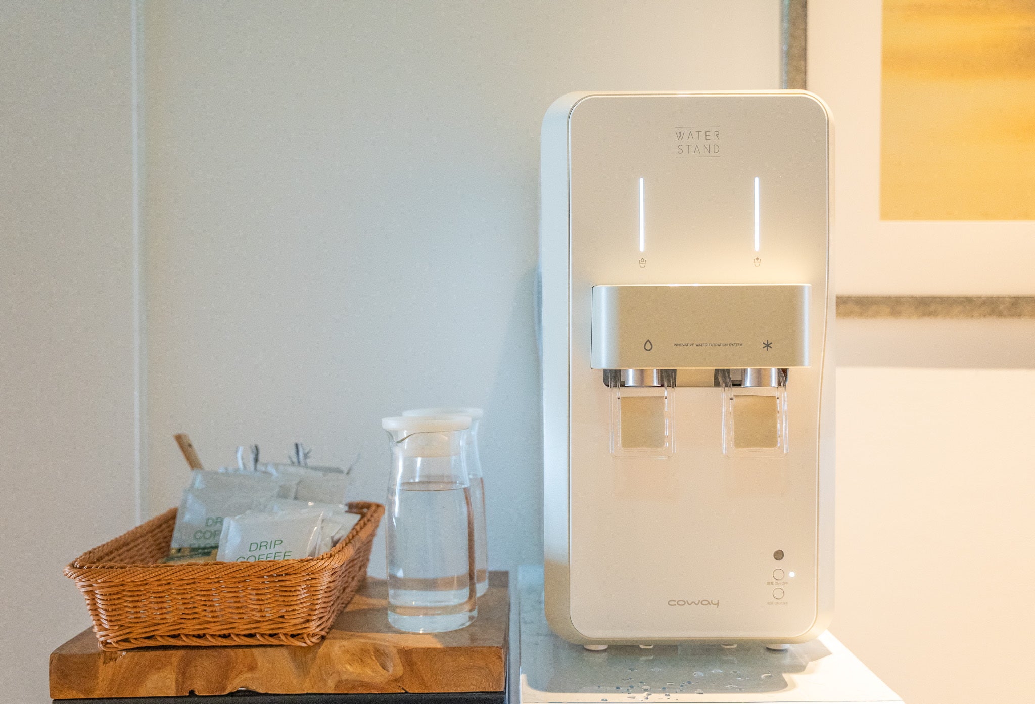 1階にアメニティーコーナーを設置し、必要なものだけ持って行っていただくスタイルに変更した。