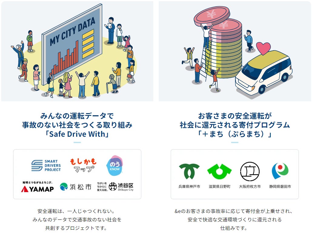 &eは、一人ひとりのお客さまに寄り添い、事故にあうお客さまを一人でも減らすために、IoTセンサーをスマートフォンに連携させるなど最新テクノロジーを活用し、お客さまにかつてない体験を提供する、新しい「共創する自動車保険」です。