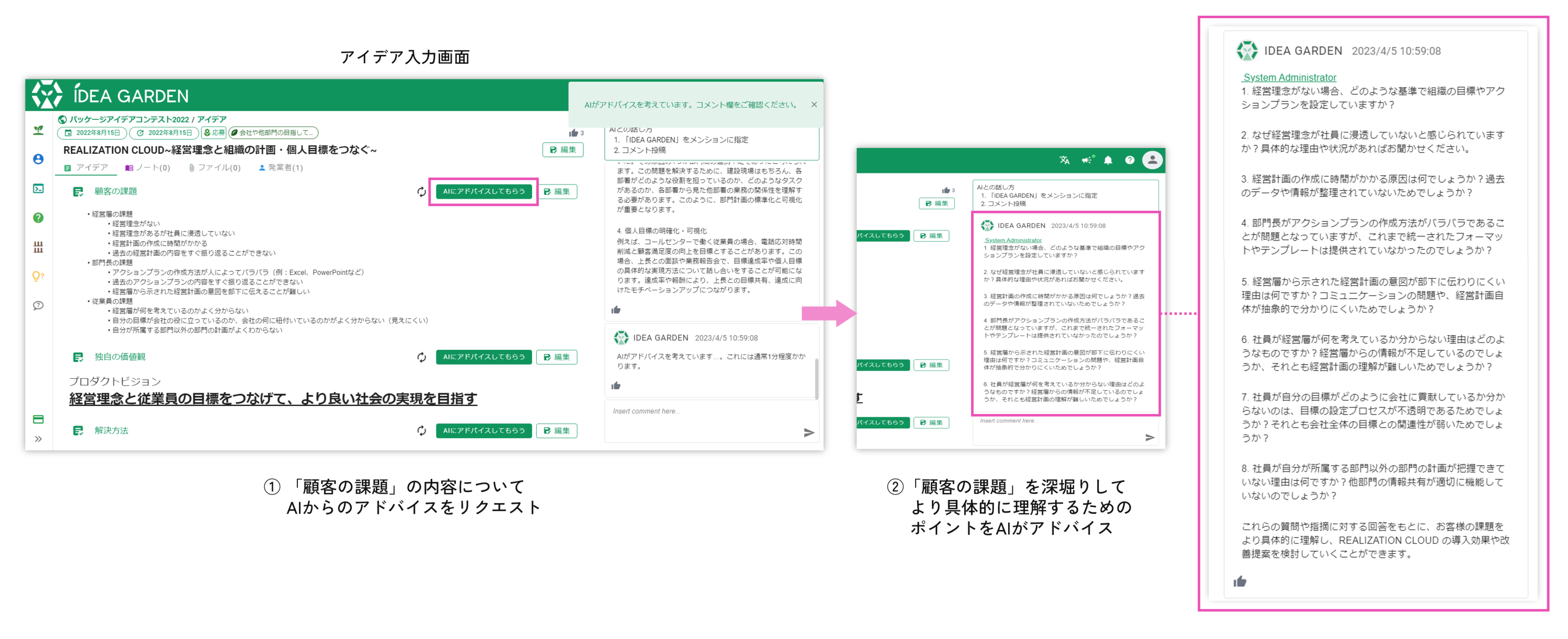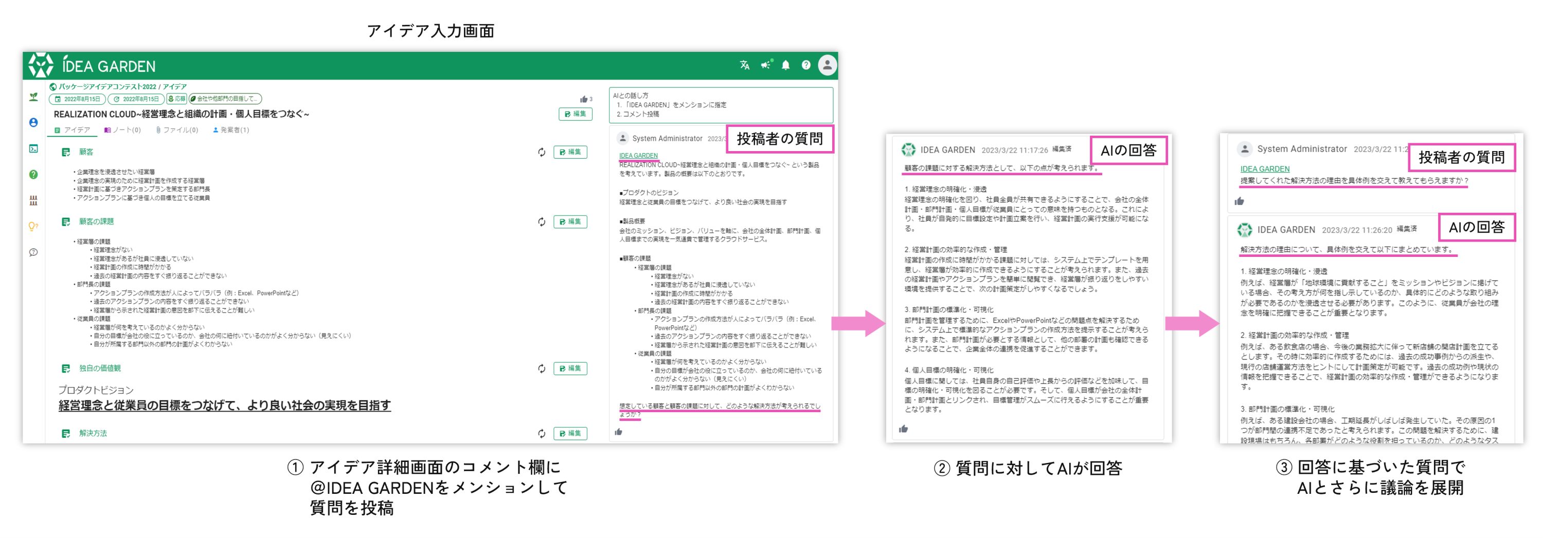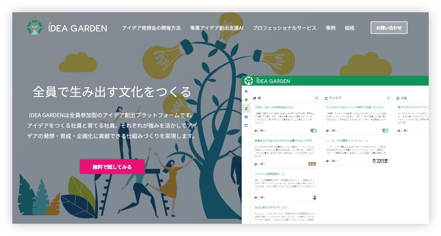 IDEA GARDENは、アイデアの発想・育成・蓄積の仕組みをツール化した「全員参加型」のアイデア創出プラットフォームです。アイデアをつくる社員と育てる社員、それぞれが強みを活かしてアイデアの発想・育成・企画化に貢献できる仕組みづくりを実現します。
